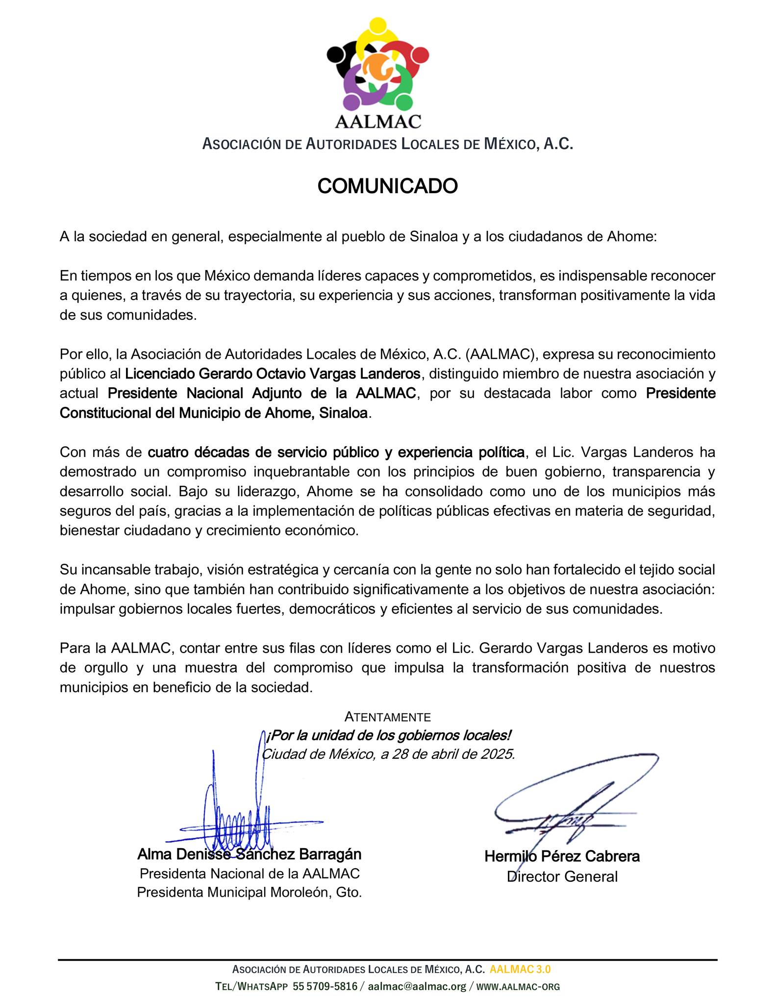 CDMX. – La Asociación de Autoridades Locales de México AC reconoció la trayectoria del Presidente Adjunto de la AALMAC por su destacada labor como Presidente Constitucional del Municipio de Ahome, Gerardo Vargas Landeros.