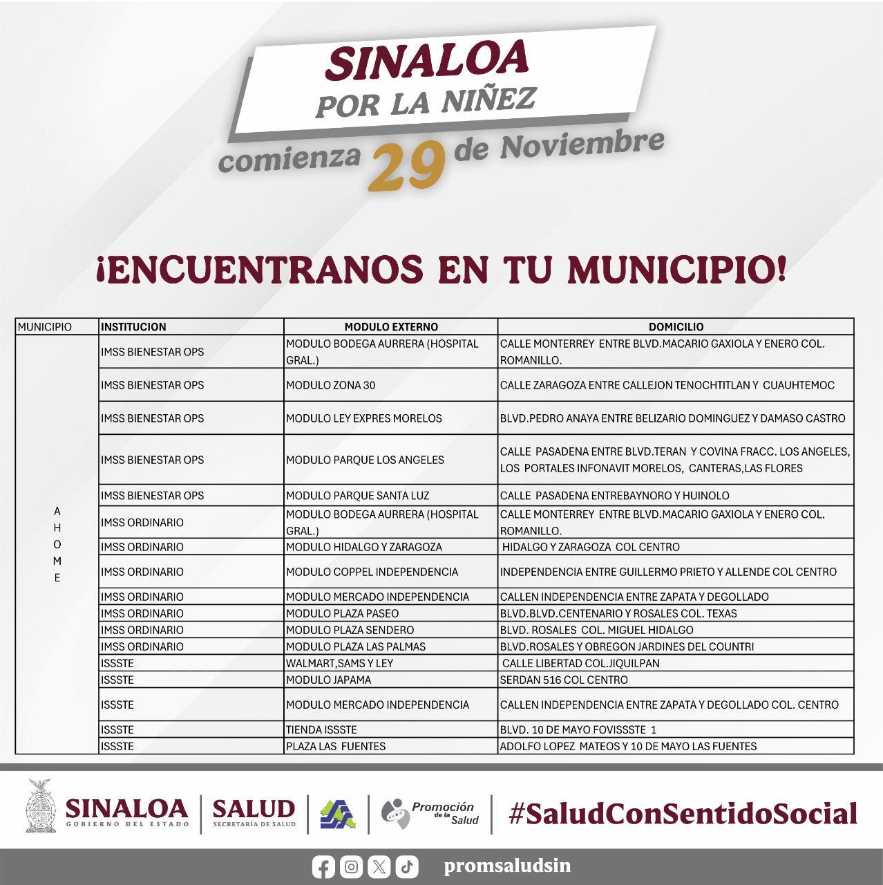 Los Mochis, Ahome, Sinaloa. –A partir de este viernes 29 de noviembre dio inicio en Ahome la jornada “Sinaloa por la Niñez”, una estrategia estatal de vacunación que busca completar los esquemas pendientes, especialmente en niñas y niños, informó la doctora María Isabel Astorga Soto, Directora de Salud Municipal, quien destacó el acompañamiento del Presidente Municipal Antonio Menéndez De Llano Bermúdez para fortalecer las acciones preventivas en el municipio.