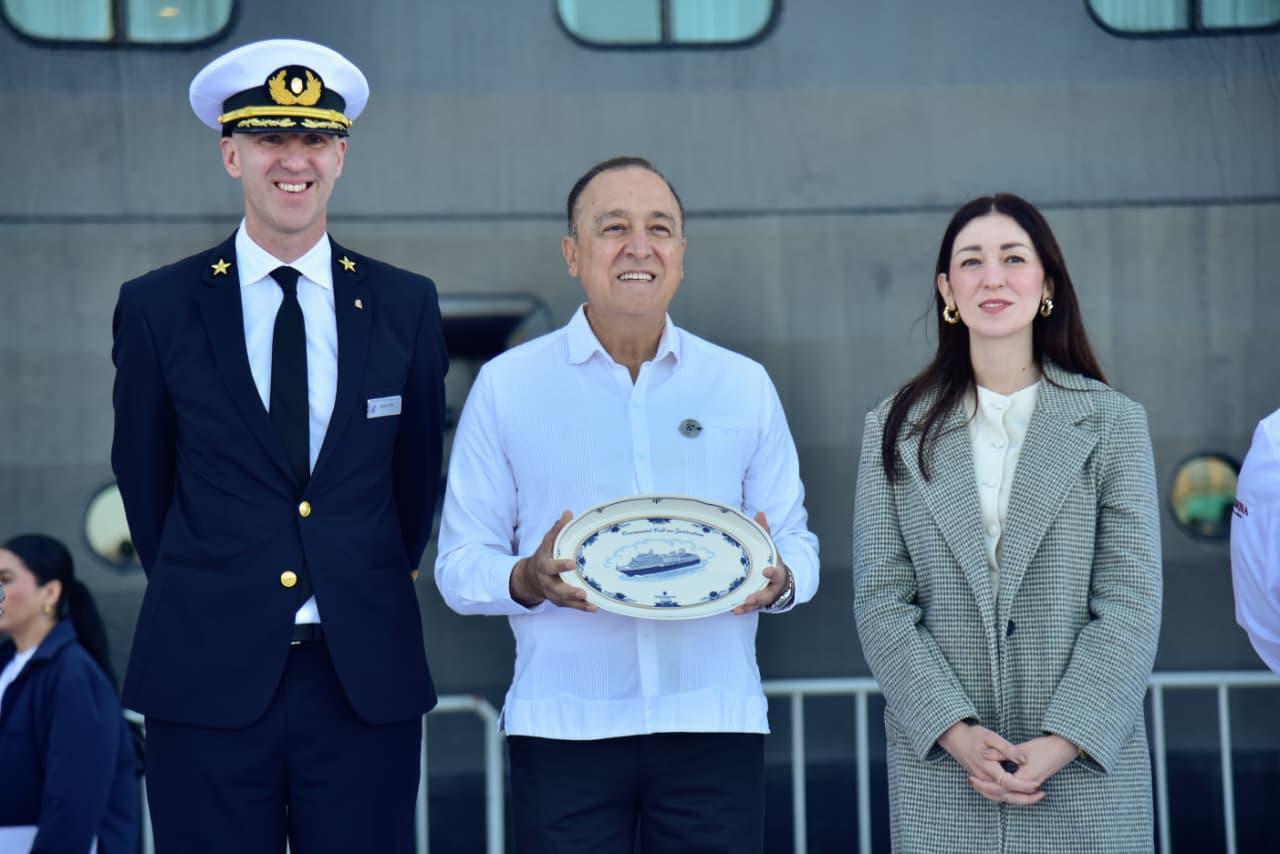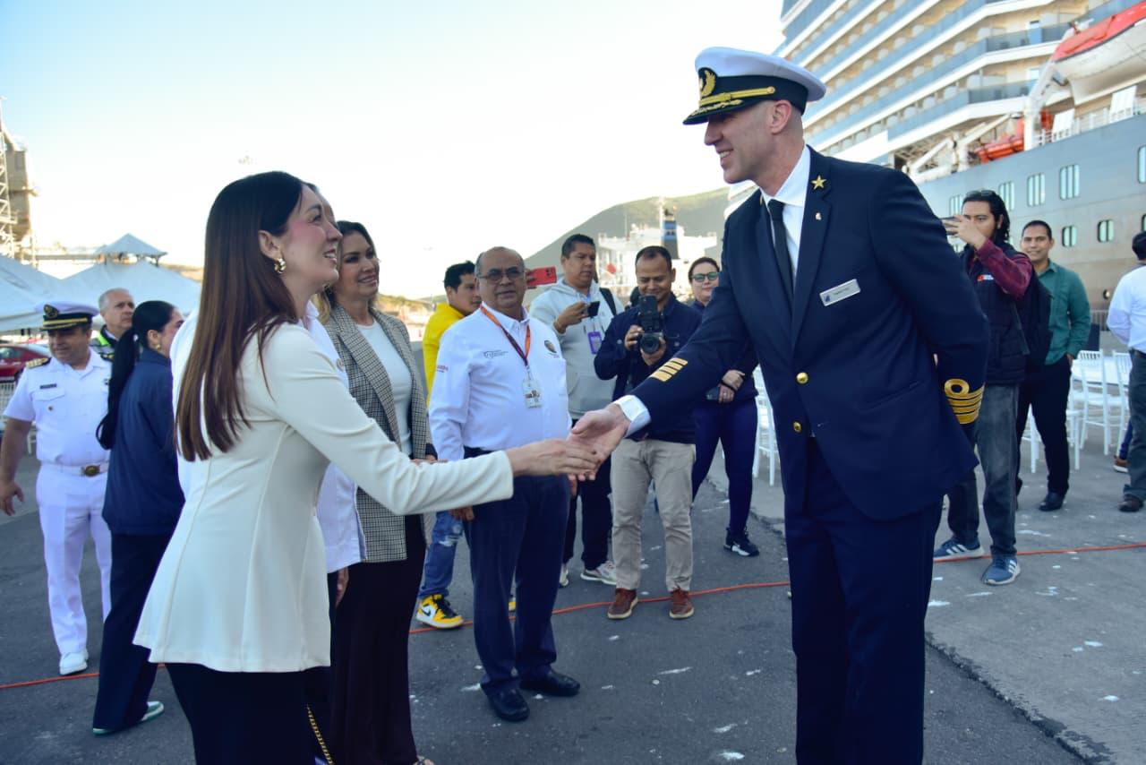 *El Presidente Municipal Antonio Menéndez de Llano Bermúdez encabezó la recepción del crucero de Holland America Line; el capitán Friso Kramer Gezegd Freher destacó que Ahome es un destino seguro y agradeció la hospitalidad de las autoridades y la población
