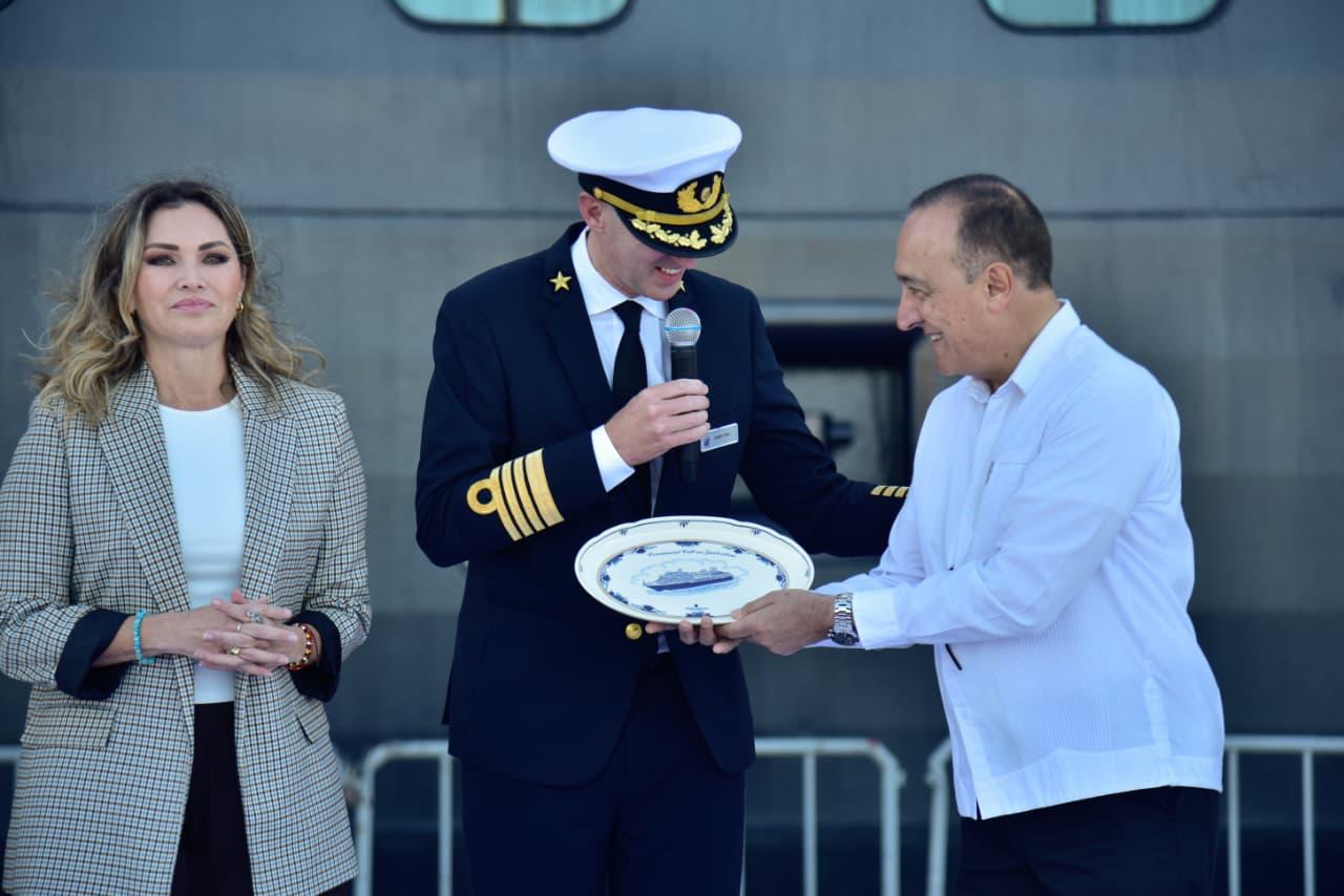 Durante el evento, autoridades municipales y estatales entregaron artesanías regionales al capitán del crucero, quien correspondió con la entrega de un plato conmemorativo al Presidente Municipal de Ahome, como símbolo del intercambio de amistad y reconocimiento entre ambas partes.