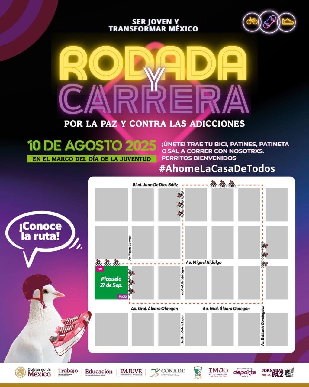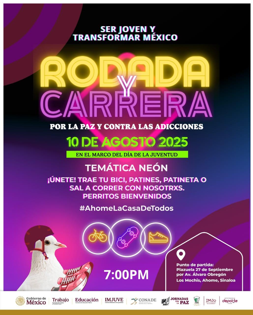 Los Mochis, Ahome, Sinaloa. –El próximo 10 de agosto el municipio de Ahome se unirá a la celebración nacional de la “Rodada y Carrera por la Paz y Contra las Adicciones”, una actividad que busca fomentar la convivencia, el deporte y la prevención de adicciones entre la juventud. El evento, impulsado por el Gobierno de México y la Presidenta Claudia Sheinbaum, a través del Instituto Mexicano de la Juventud, contará con un recorrido de seis kilómetros y la participación de ciclistas, patinadores, corredores y toda la comunidad, bajo una vibrante temática neón.