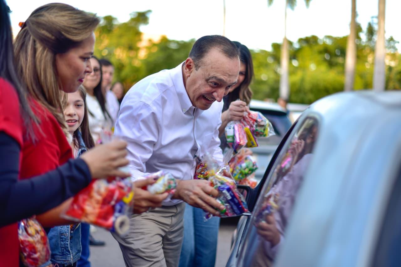 Además de sus hijas y nietas, el Alcalde estuvo acompañado de funcionarios y regidores, quienes también se sumaron a la tarea de repartir la tradicional rosca, chocolate, dulces y pelotas a las familias que acudieron al festejo caminando, en auto, bici o motocicleta.