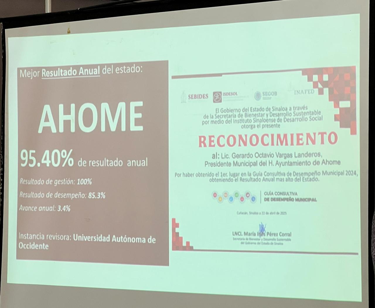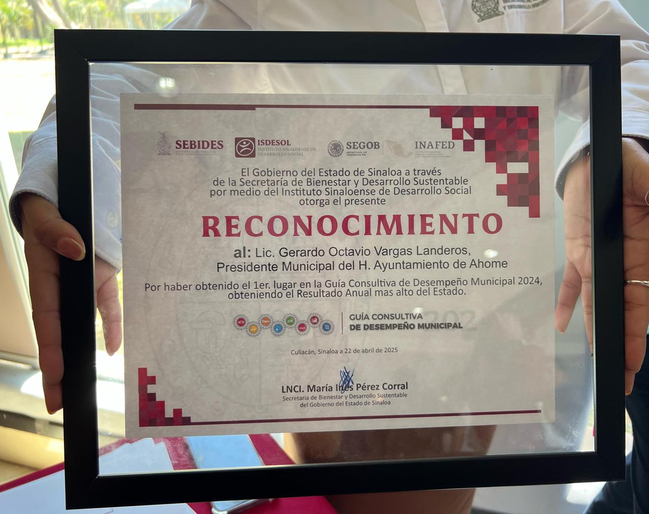 Los Mochis, Ahome, Sinaloa. – El Presidente Municipal Gerardo Vargas Landeros fue reconocido por el Gobierno del Estado de Sinaloa, mediante la Secretaría de Bienestar y Desarrollo Sustentable y el Instituto Sinaloense de Desarrollo Social (ISDESOL), toda vez que el Ayuntamiento de Ahome logró el primer lugar en la Guía Consultiva de Desempeño Municipal 2024, obteniendo el resultado anual más alto de toda la entidad. Además, fue premiado por implementar la mejor práctica municipal del estado con el proyecto “Por Humanismo, JAPAMA de tu lado”.