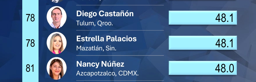 Por lo pronto la famosa casa encuestadora Mitofsky revela en su estudio de abril publicado en El Financiero que Estrella Palacios tiene una aprobación media- no sobresaliente- con 48.1 por ciento y ubicada en el lugar 78 de 150 Alcaldes y Alcaldesas del país.