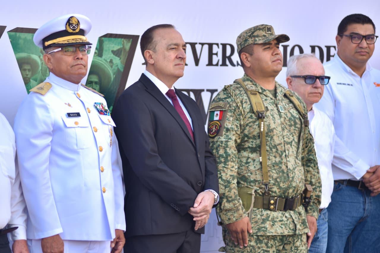 Los Mochis, Ahome, Sinaloa. – Con un mensaje de reconocimiento y honra para las mujeres y hombres valientes que hace 115 años sembraron la semilla del movimiento de la Revolución Mexicana de 1910, el Presidente Municipal Antonio Menéndez De Llano Bermúdez, junto con mandos militares, y autoridades civiles, educativas y ciudadanos y cientos de estudiantes ahomenses, realizaron acto cívico en Palacio Municipal.