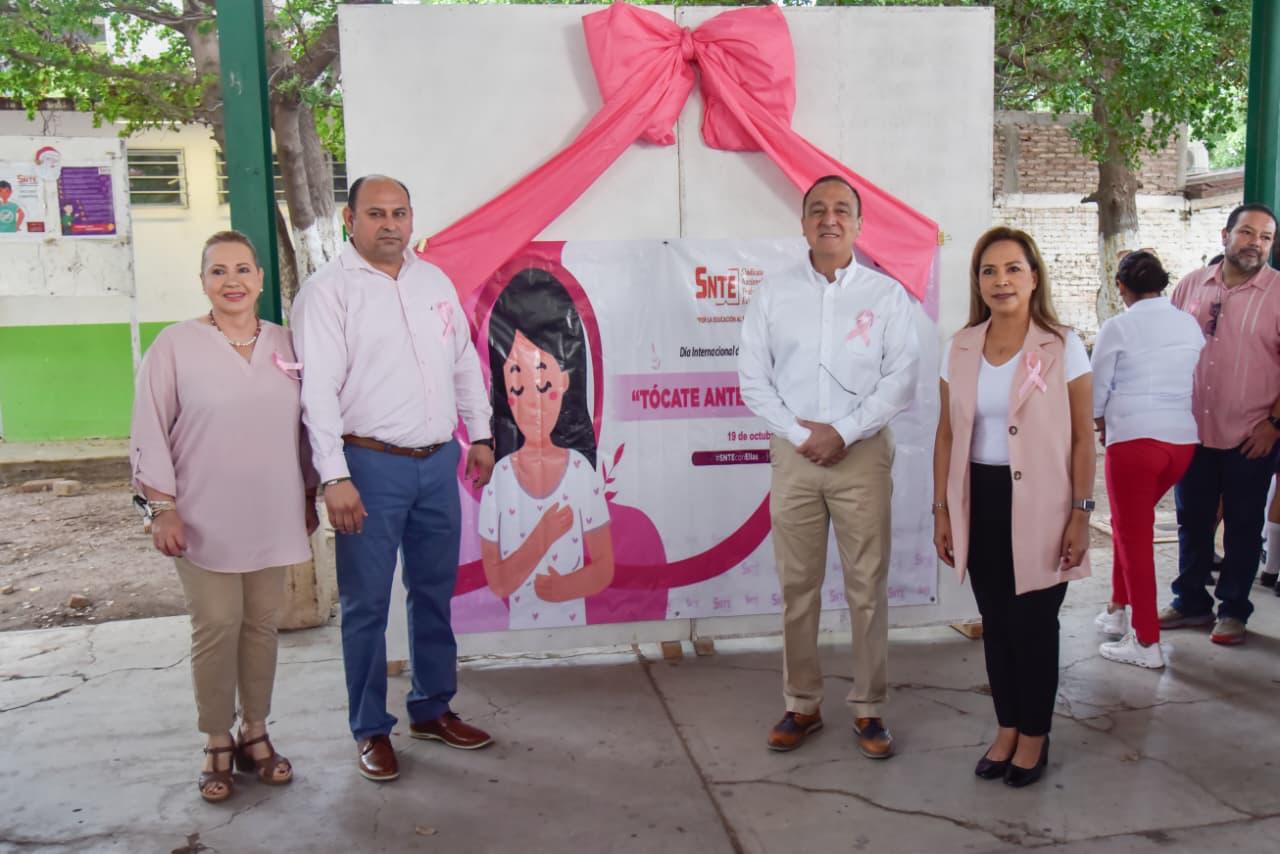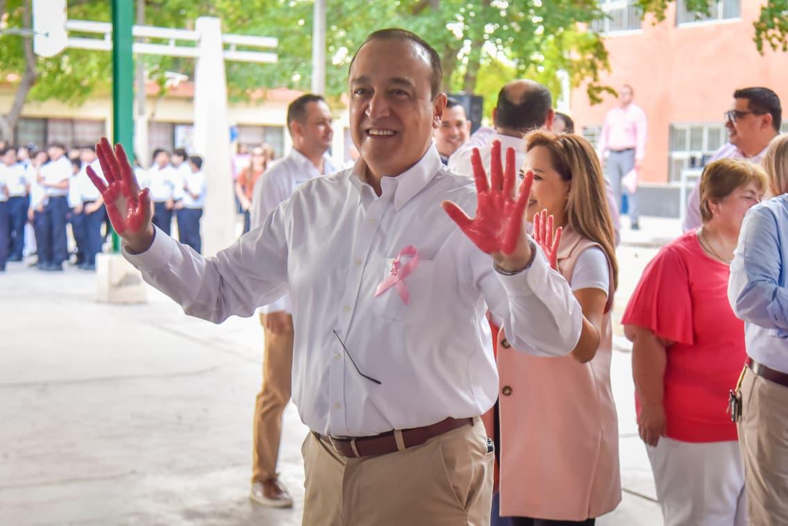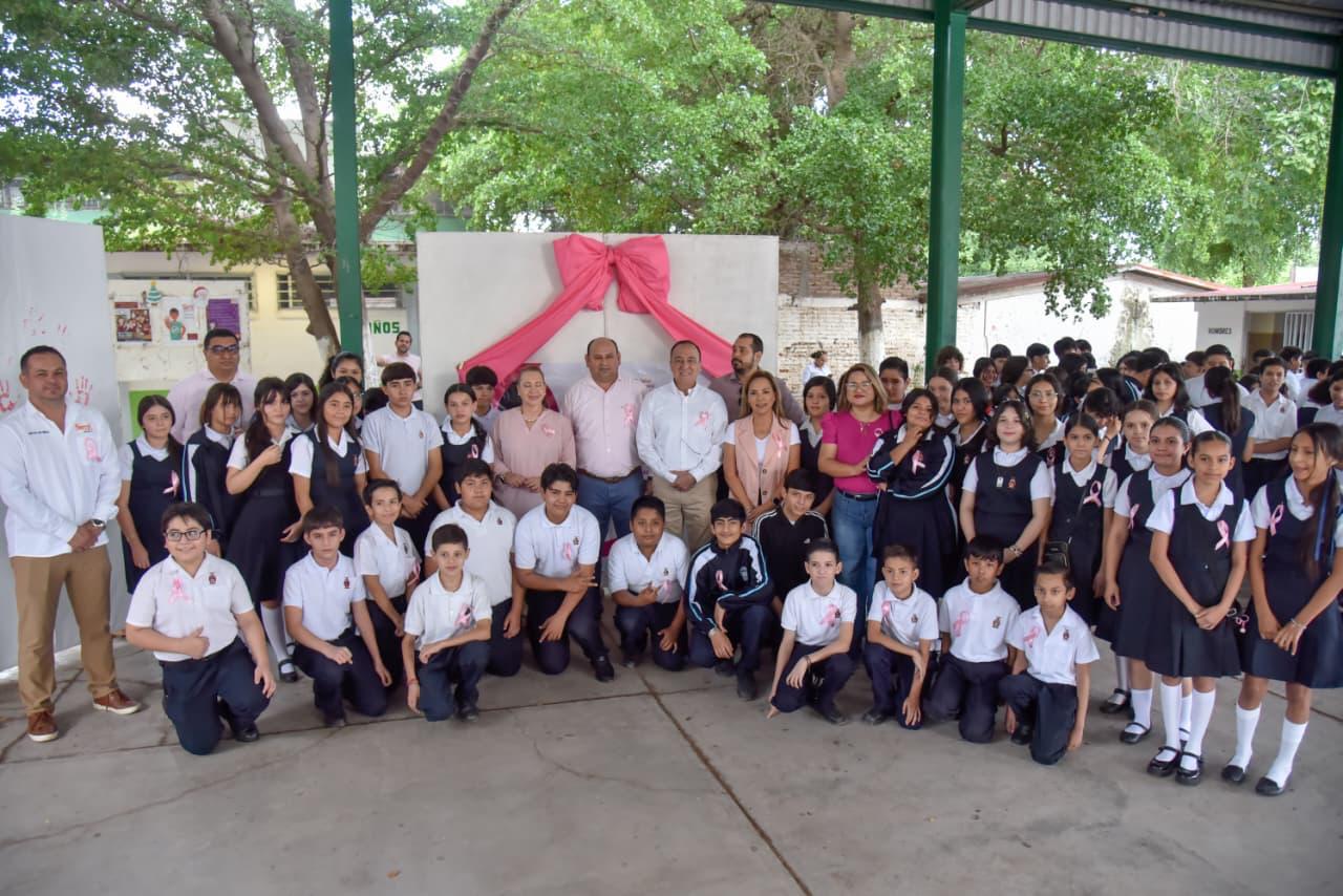 *El alcalde de Ahome encabezó el evento “Octubre Rosa, en nuestras manos”, acto conmemorativo en la Secundaria SNTE 1 Sección 53 Matutina, donde autoridades y estudiantes plasmaron sus huellas rosas como símbolo de esperanza y unidad en la prevención de esta enfermedad