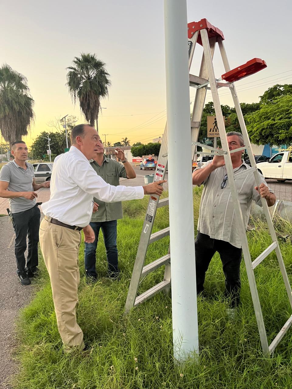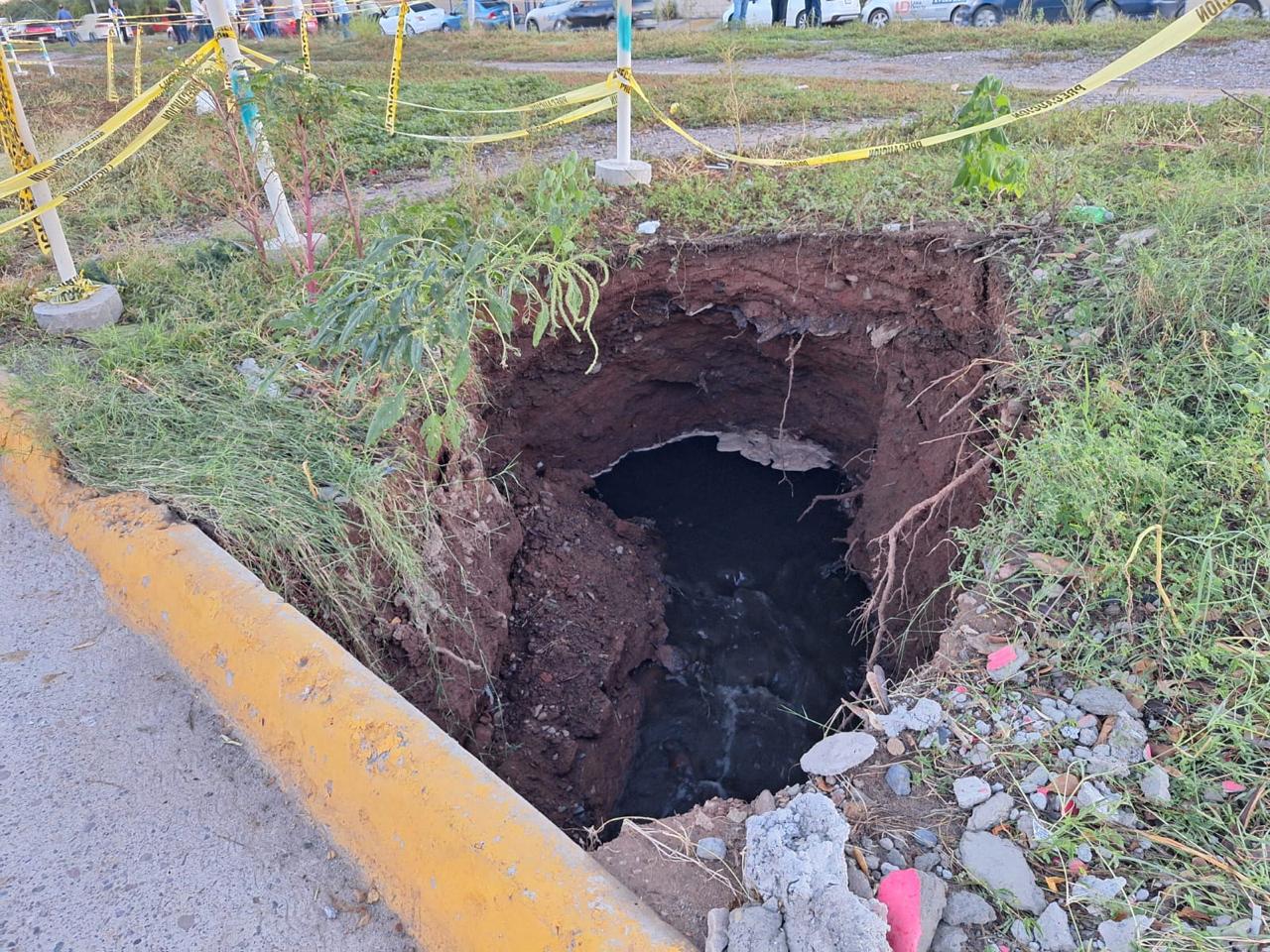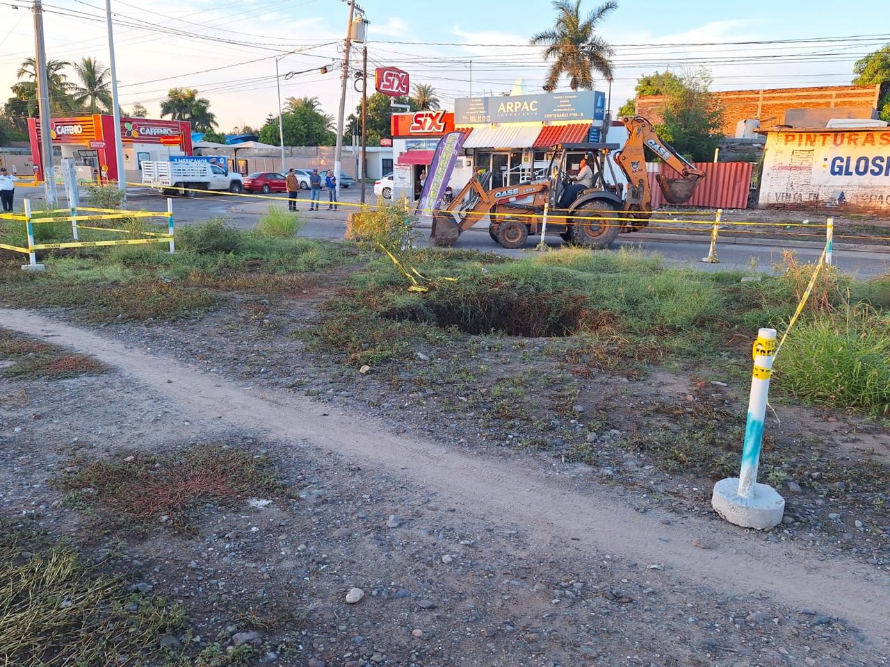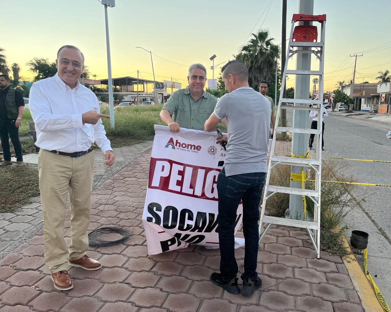 Los Mochis, Sinaloa. – En punto de las cinco de la tarde, el alcalde Antonio Menendez De Llano Bermúdez, se dio cita por segundo día consecutivo en el nuevo socavón que se descubrió en Boulevard Centenario y calle Niños Héroes, acompañado de los Regidores, titulares de Obras Públicas, Japama, COMUN, Tesoreria, Tránsito Municipal y Seguridad Pública.