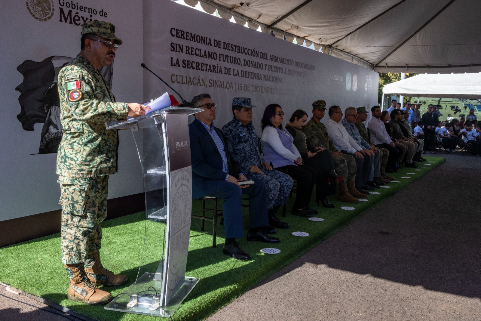 Las armas que hoy serán inutilizadas son el resultado del trabajo firme y constante de las Fuerzas Armadas, en conjunto con las fiscalías e instituciones de seguridad pública como la Guardia Nacional, las policías estatales y municipales en su lucha contra la delincuencia y en la preservación del orden y la justicia. Su aseguramiento representa la acción decidida y coordinada de los gobiernos de la república, del estado de Sinaloa y del municipio de Culiacán para restablecer la tranquilidad y organizar el estado de derecho en cada rincón de nuestro país”, afirmó el comandante de la Novena Zona Militar.
