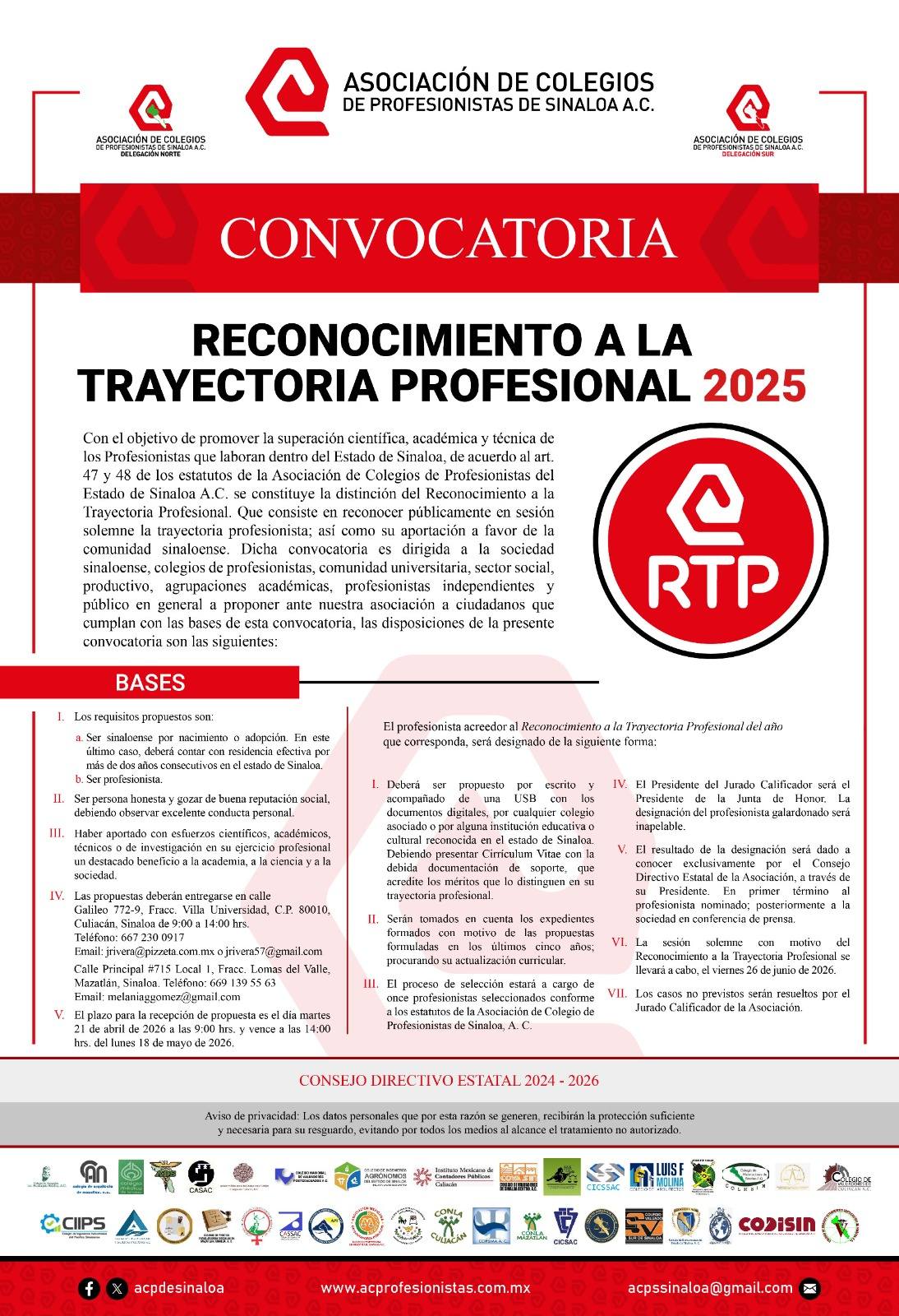 La Asociación de Colegios de Profesionistas de Sinaloa A.C., uno de los organismos públicos que sostiene una amplia sinergia con la Universidad Autónoma de Sinaloa (UAS), presentó este 21 de abril la convocatoria para el Reconocimiento a la Trayectoria Profesional 2025, galardón que busca incentivar la superación científica, académica y técnica entre los profesionales que ejercen en el estado.