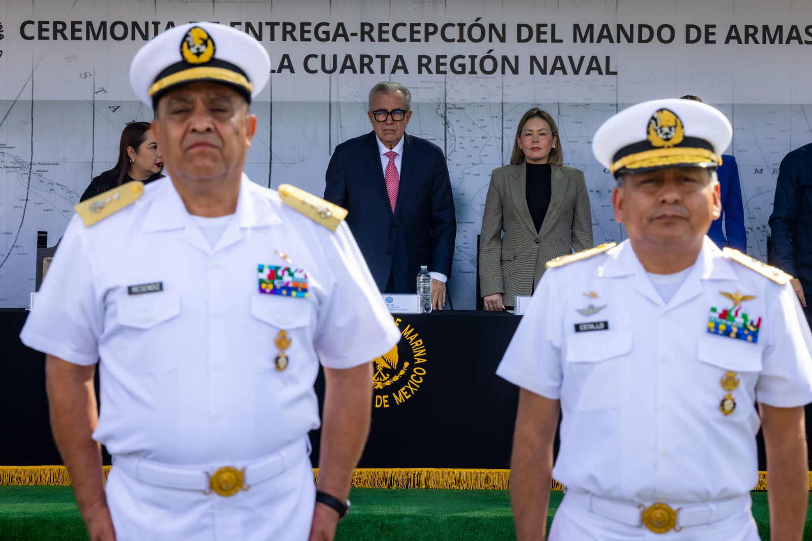 La ceremonia, realizada en las instalaciones de la Cuarta Región Naval, contó con la presencia del contralmirante Mariel Aquileo Ancona, director general de la administración del Sistema Portuario Nacional; Claudia Zulema Sánchez, fiscal general del Estado; Óscar Rentería Schazarino, secretario de Seguridad Pública Estatal; Víctor Luis Soto, encargado de la Fiscalía Federal en el estado de Sinaloa, así como autoridades civiles, Navales y militares.