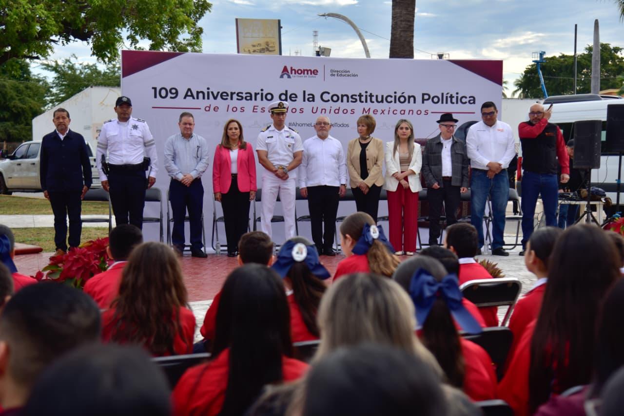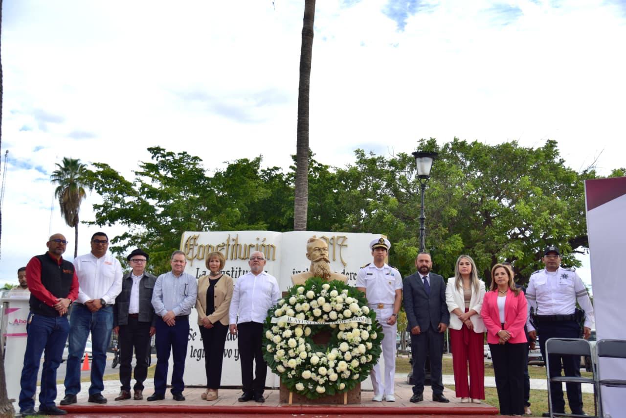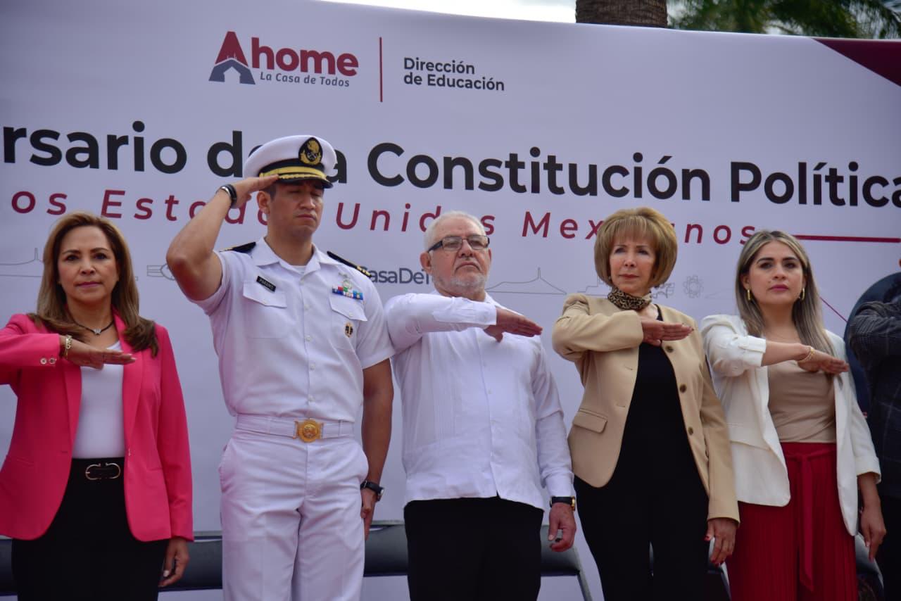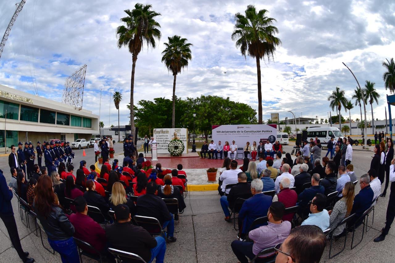 Los Mochis, Ahome, Sinaloa. – Con una exaltación a honrar el legado de la Constitución Política Mexicana de 1917, que esta fecha cumple 109 años de su promulgación, y que garantiza los valores de la igualdad, democracia, justicia social, libertad y solidaridad, autoridades municipales, educativas, militares, ciudadanos, estudiantes y agrupaciones de juristas, se reunieron para conmemorar la promulgación de la Carta Magna de los Estados Unidos Mexicanos de 1917, que representa los principios liberales plasmados en la Constitución de 1857.