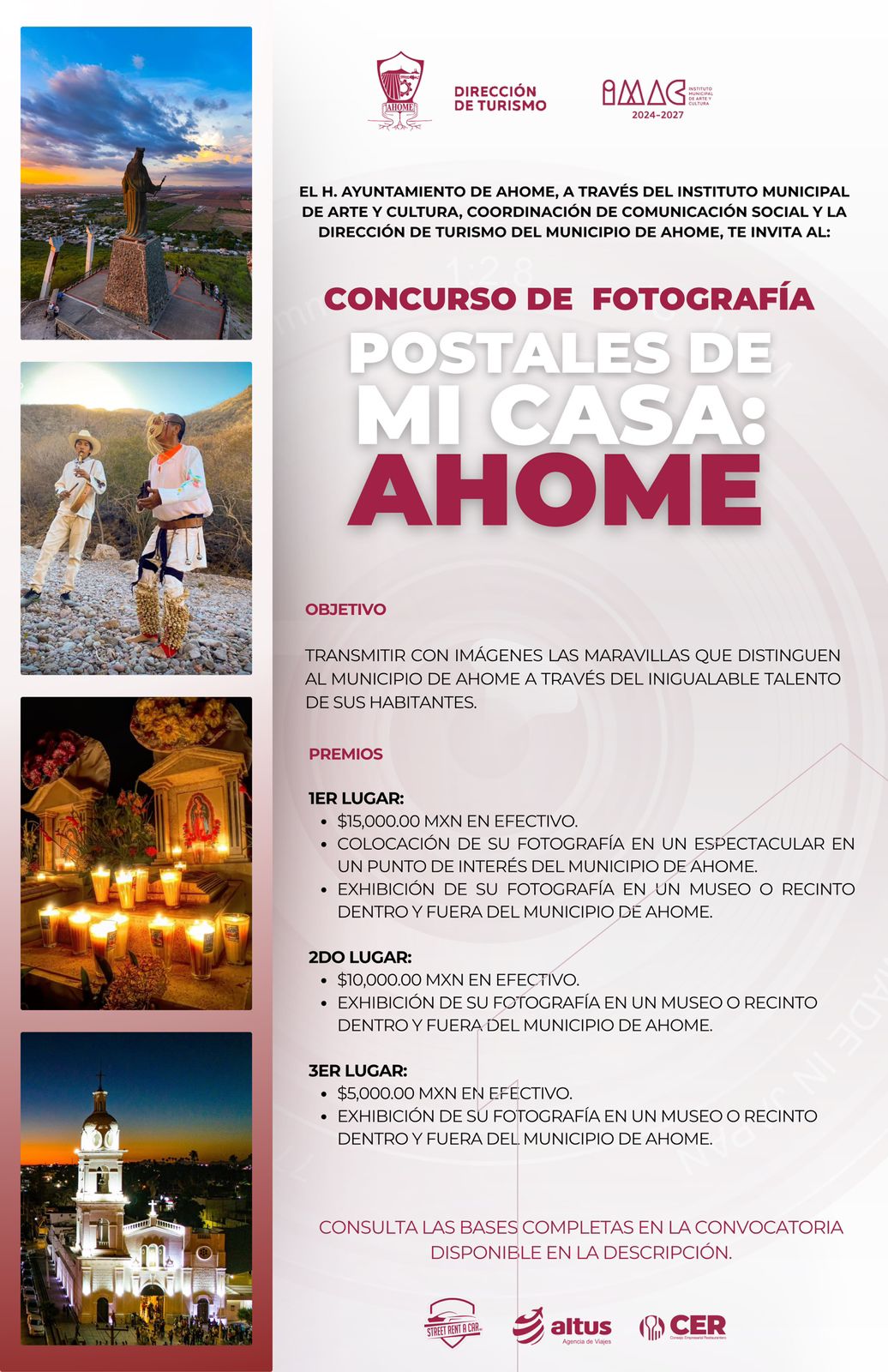 Los Mochis, Ahome, Sinaloa. –El Gobierno de Ahome, a través de las direcciones de Turismo, Comunicación Social, y el Instituto de Arte y Cultura, convocan a los ahomenses a participar en el primer concurso de fotografía “Postales de mi Casa: Ahome”, que ofrece una bolsa financiera de 30 mil pesos repartidos en los primeros tres lugares, así como la edición de un catálogo digital y la exhibición de las fotografías participantes.