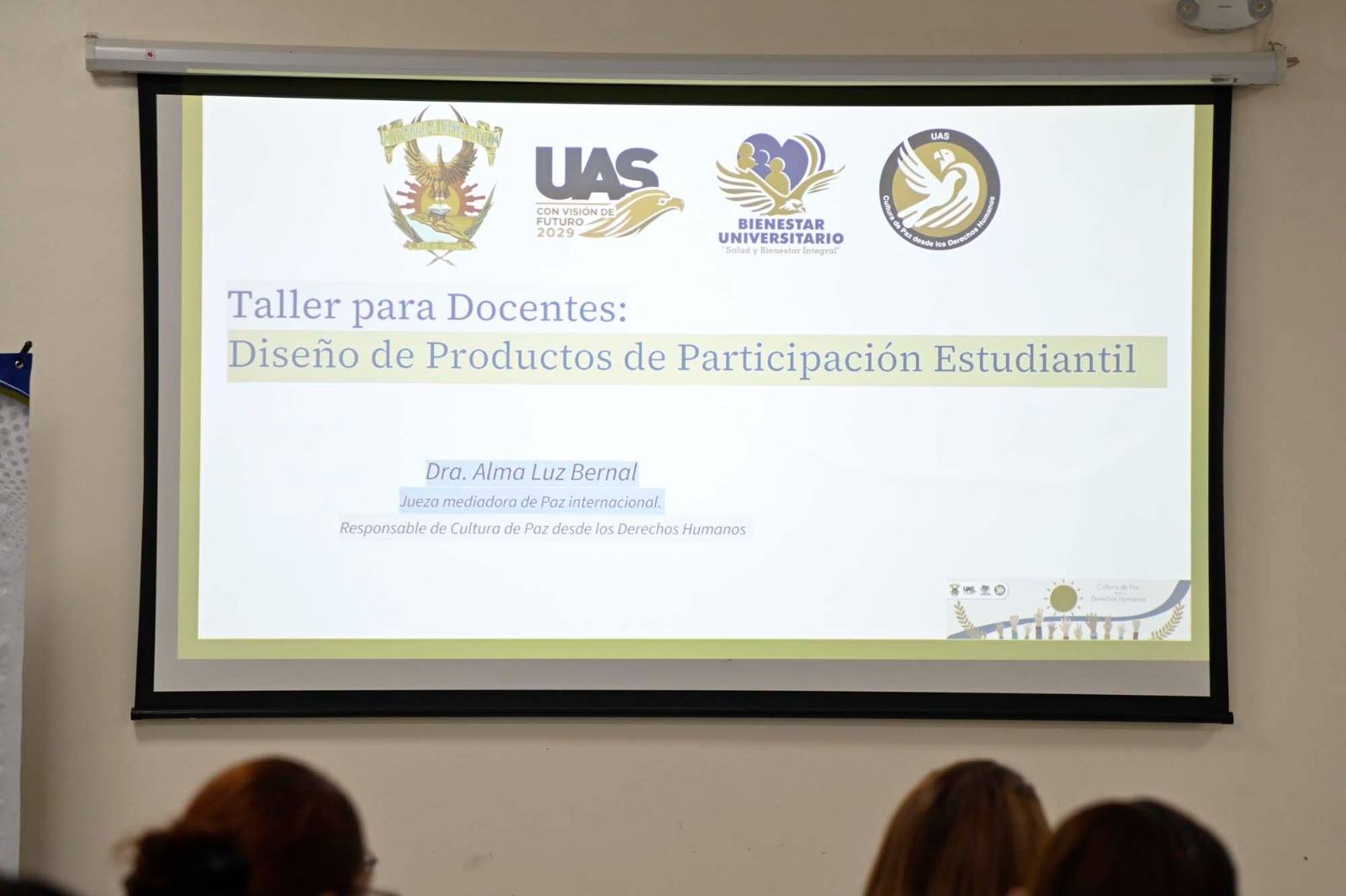 Con el firme objetivo de fortalecer el tejido social desde las aulas, la Universidad Autónoma de Sinaloa (UAS), a través de la Unidad de Bienestar Universitario (UBU), llevó a cabo el taller para docentes “Diseño de Productos de Participación Estudiantil en Cultura de Paz y Derechos Humanos”, impartido por la doctora Alma Luz Bernal, Juez Mediadora de Paz Internacional.