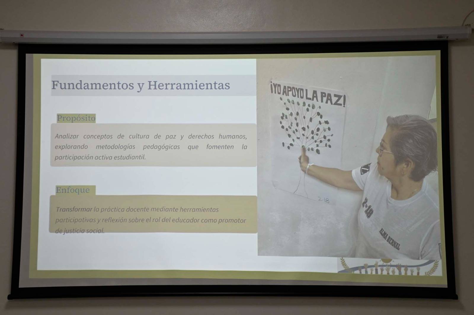 En este espacio, la especialista compartió con los asistentes, de manera práctica y reflexiva, conceptos y herramientas diseñadas para incentivar la participación estudiantil real y efectiva. Además, se desarrollaron estrategias y productos educativos con el propósito de institucionalizar la Cultura de Paz desde los Derechos Humanos.