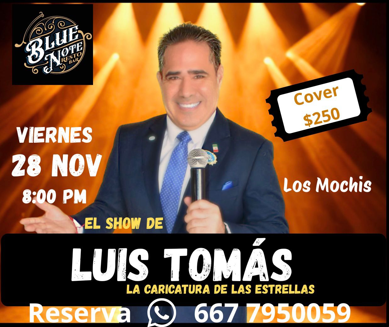 Los Mochis, Sinaloa. – Un show irresistible y que de nuevo cuenta con el aval de calidad del comediante de la cola de caballo Teo González, se presentará este viernes en esta ciudad. La voz imitadora más internacional “Luis Tomás”, la Caricatura de las Estrellas, hará gala de sus interpretaciones en Blue Note Resto Bar a partir de las ocho de la noche.