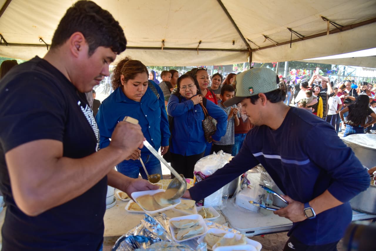 *Durante la multitudinaria fiesta con regalos, comida, y otros apoyos asistenciales, el Gobernador Rubén Rocha Moya anunció al Alcalde Antonio Menéndez que aportará 5 mdp para atender el tema del drenaje en esa comunidad