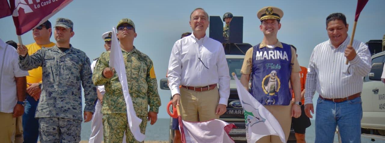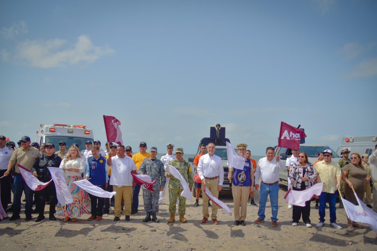 Playa de El Maviri, Ahome, Sinaloa. – Desde playa El Maviri, el Presidente Municipal de Ahome, Antonio Menéndez de Llano Bermúdez, encabezó el banderazo de inicio del operativo Semana Santa Segura 2026, mediante el cual autoridades de los tres órdenes de gobierno, Marina, DEFENSA, Guardia Nacional, corporaciones de seguridad y cuerpos de auxilio trabajarán de manera coordinada para proteger a las familias ahomenses y visitantes durante el periodo vacacional.