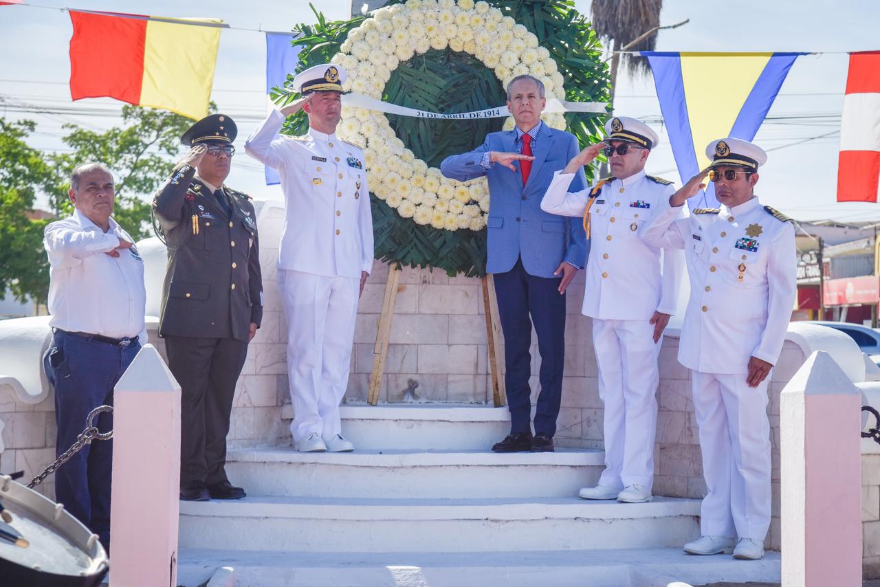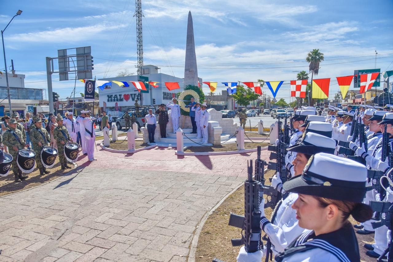 Durante el evento celebrado en el Obelisco erigido a los Héroes Navales, en el cruce de los bulevares Rosendo G. Castro y Macario Gaxiola de la ciudad de Los Mochis, el Alcalde Vargas Landeros, junto con los jefes militares y navales, encabezados por el comandante de la Octava Zona Naval de Topolobampo, Vicealmirante Saúl Hiram Bandala Garza, colocaron Ofrenda Floral y montaron Guardia de Honor.