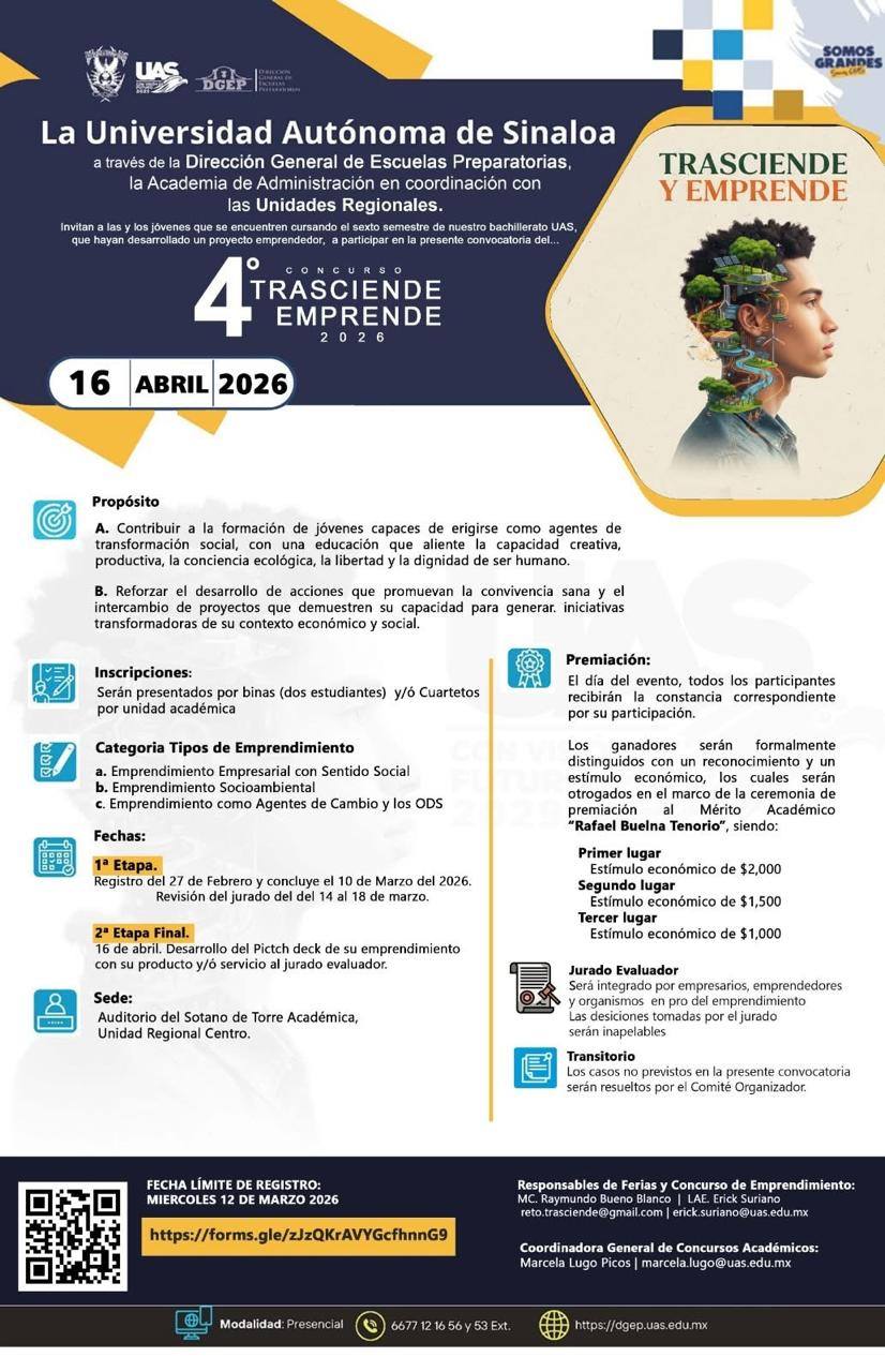 En la Universidad Autónoma de Sinaloa (UAS) existe la convicción de que el emprendimiento juvenil es una vía para generar soluciones innovadoras, desafiar lo establecido y construir proyectos con sentido propio. Por ello, la institución convoca a los estudiantes de bachillerato a participar en el 4to. Concurso “Trasciende Emprende”, cuya fase estatal se llevará a cabo el próximo 16 de abril en las instalaciones de la Torre Académica, en la ciudad de Culiacán.