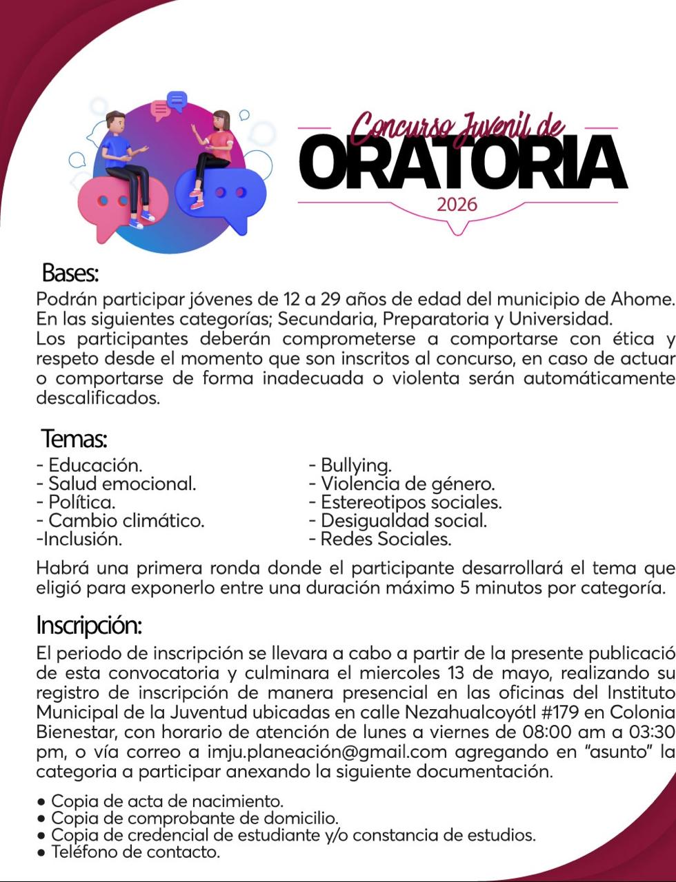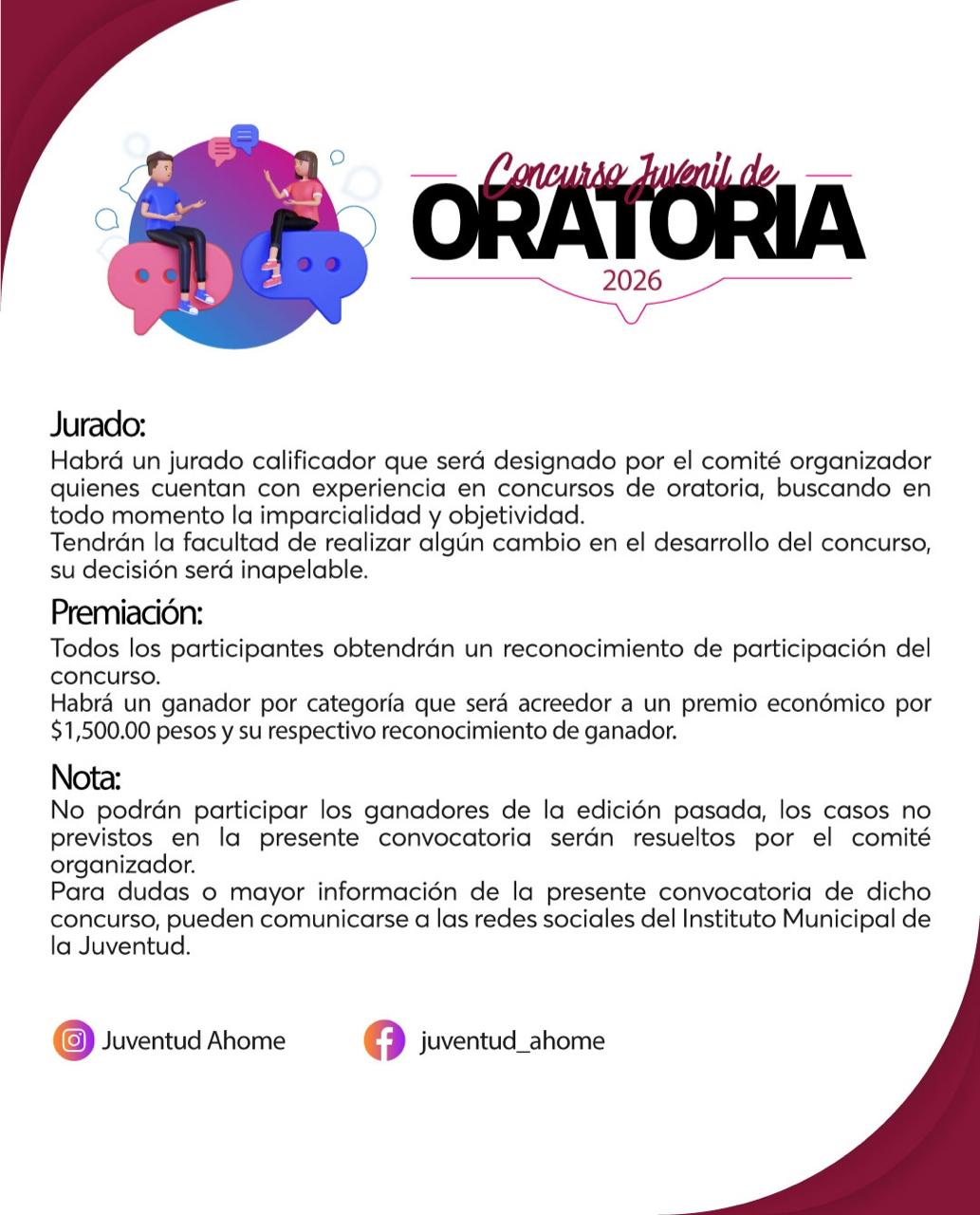 Nos da mucho gusto, por parte de la Dirección de Educación, en colaboración con nuestros amigos del Instituto Municipal de la Juventud, convocar a todas nuestras y nuestros jóvenes de 12 a 29 años a que se inscriban en este concurso de oratoria, un concurso que nos va a permitir escuchar temas de relevancia social en nuestro municipio”, manifestó.