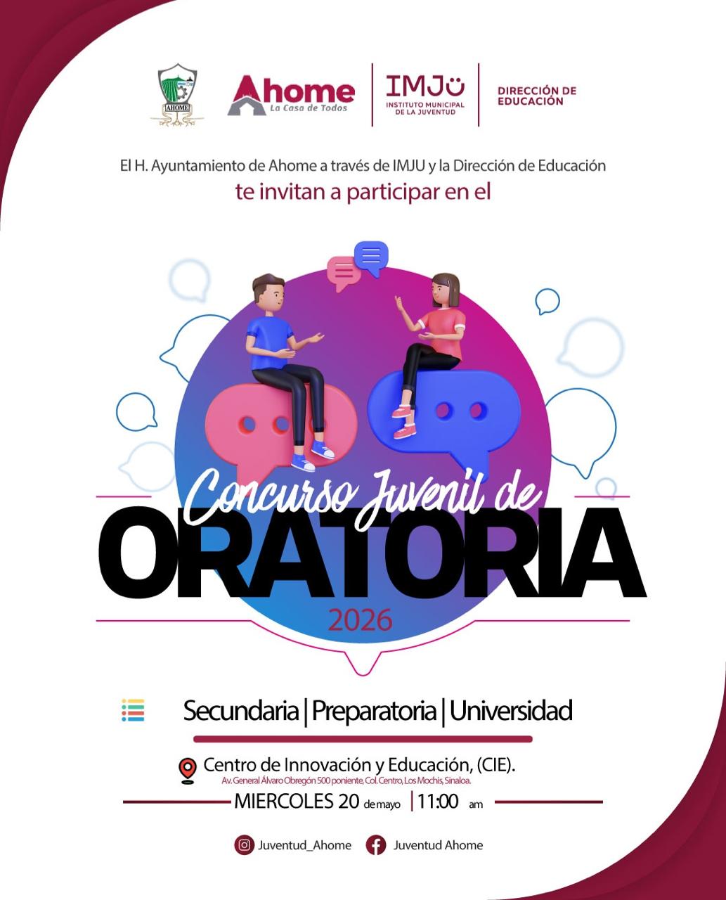 Los Mochis, Ahome, Sinaloa. –Con el respaldo del Gobierno Municipal que encabeza el Alcalde Antonio Menéndez de Llano Bermúdez, el Instituto Municipal de la Juventud (IMJU), en coordinación con la Dirección de Educación, lanzó la convocatoria para el Concurso Juvenil de Oratoria 2026, espacio que busca abrir la participación de los jóvenes ahomenses en temas de relevancia social.