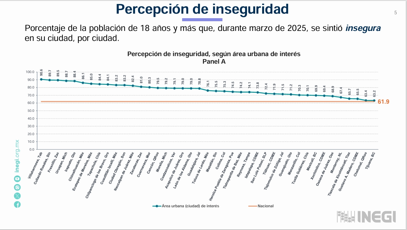 De acuerdo a la Encuesta Nacional de Seguridad Pública Urbana (ENSU), correspondiente al primer trimestre de 2025, Culiacán ocupa en el segundo lugar entre las peores ciudades donde los ciudadanos mayores de 18 años no se sienten seguros