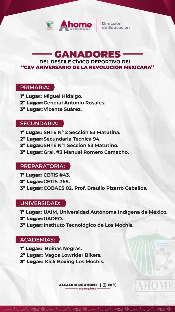 Los Mochis, Ahome, Sinaloa. – El Ayuntamiento de Ahome, a través de la Dirección de Educación, dio a conocer los resultados oficiales del Desfile Cívico Deportivo conmemorativo del 115 Aniversario de la Revolución Mexicana, luego de que el jurado calificador de los sectores militar y educativo analizara las puntuaciones otorgadas a los contingentes participantes.