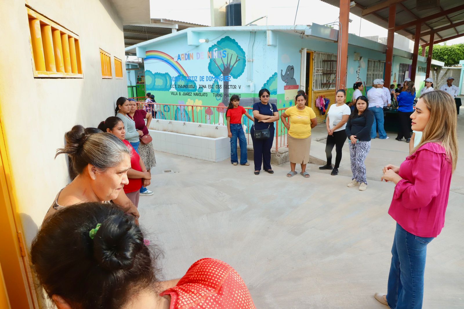 Villa Juárez, Navolato. – Comprometidos con fortalecer el tejido social y asegurar la continuidad educativa a través de la presencialidad, en la sindicatura de Villa Juárez, Navolato, por instrucciones del gobernador Rubén Rocha Moya, la mañana de este lunes, la secretaria de Educación Pública y Cultura (SEPyC), Gloria Himelda Félix, puso en marcha una estrategia integral de acompañamiento en los 24 planteles de esta sindicatura, con la participación de DIF estatal, Seguridad Pública, Semujeres, Salud, ICATSIN, ISDE, Registro Civil, la cual consiste en un acercamiento con la planta docente, así como padres y madres de familia, para realizar acuerdos integrales que construyan confianza con las familias.