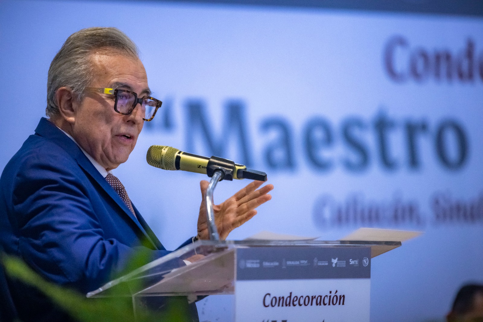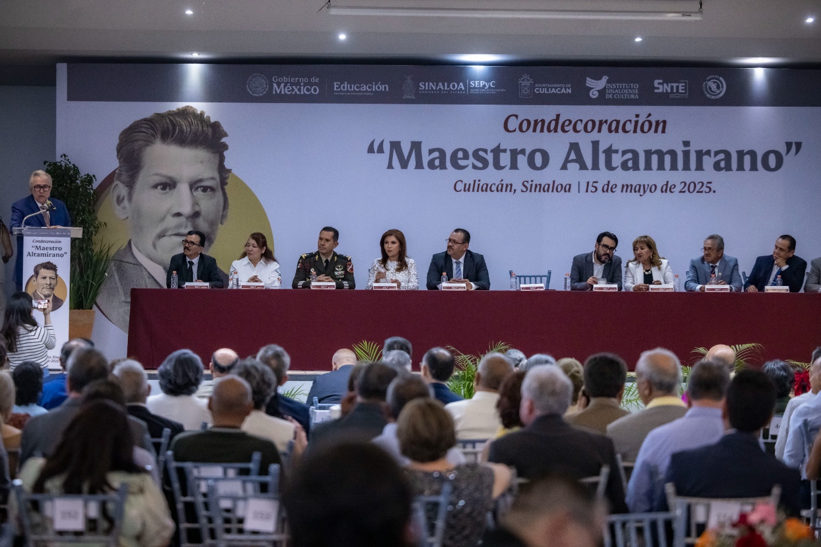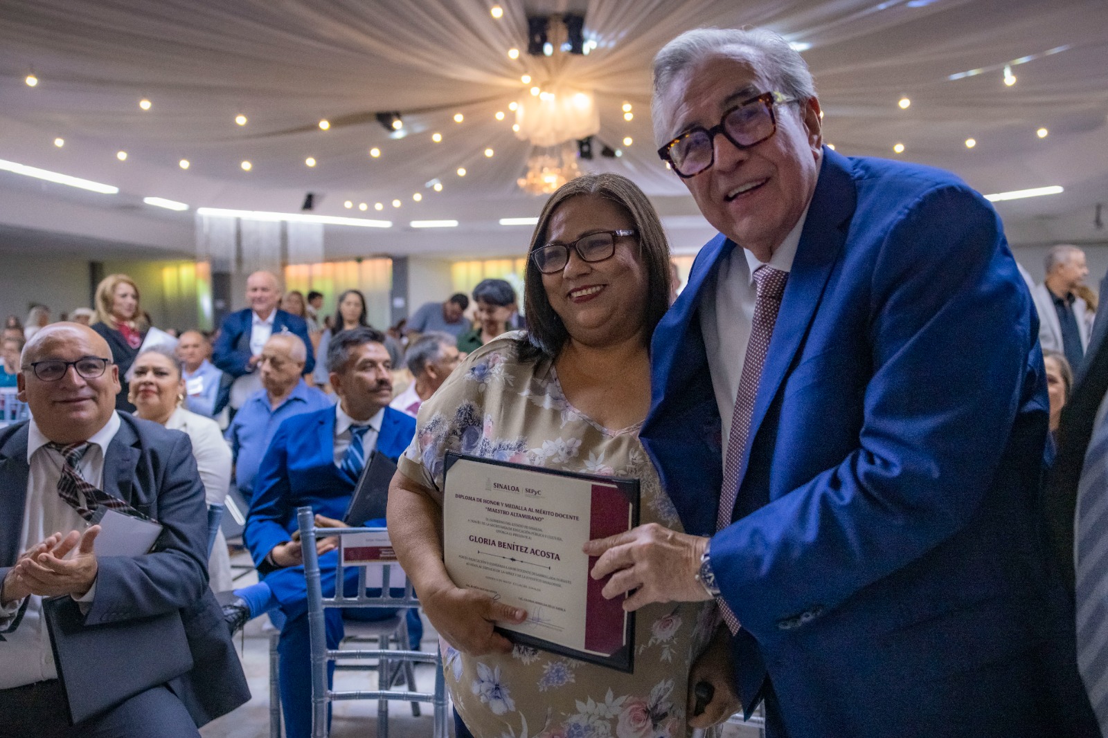 El mandatario estatal reconociendo la trayectoria y el compromiso con la educación, acompañado de Gloria Himelda Félix Secretaria de Educación Pública estatal y Genaro Torrecillas líder de la Sección 27 del SNTE, hizo entrega de la condecoración “Maestro Altamirano” a 162 docentes de educación básica y media, que cumplen 40 años o más al servicio educativo de Sinaloa y el país.