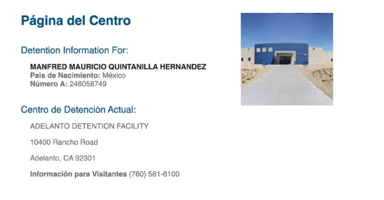 De acuerdo con el registro del Servicio de Control de Migración y Aduanas (ICE, en inglés), Quintanilla Hernández se encuentra preso en California, en el Centro de Detención de Adelanto.