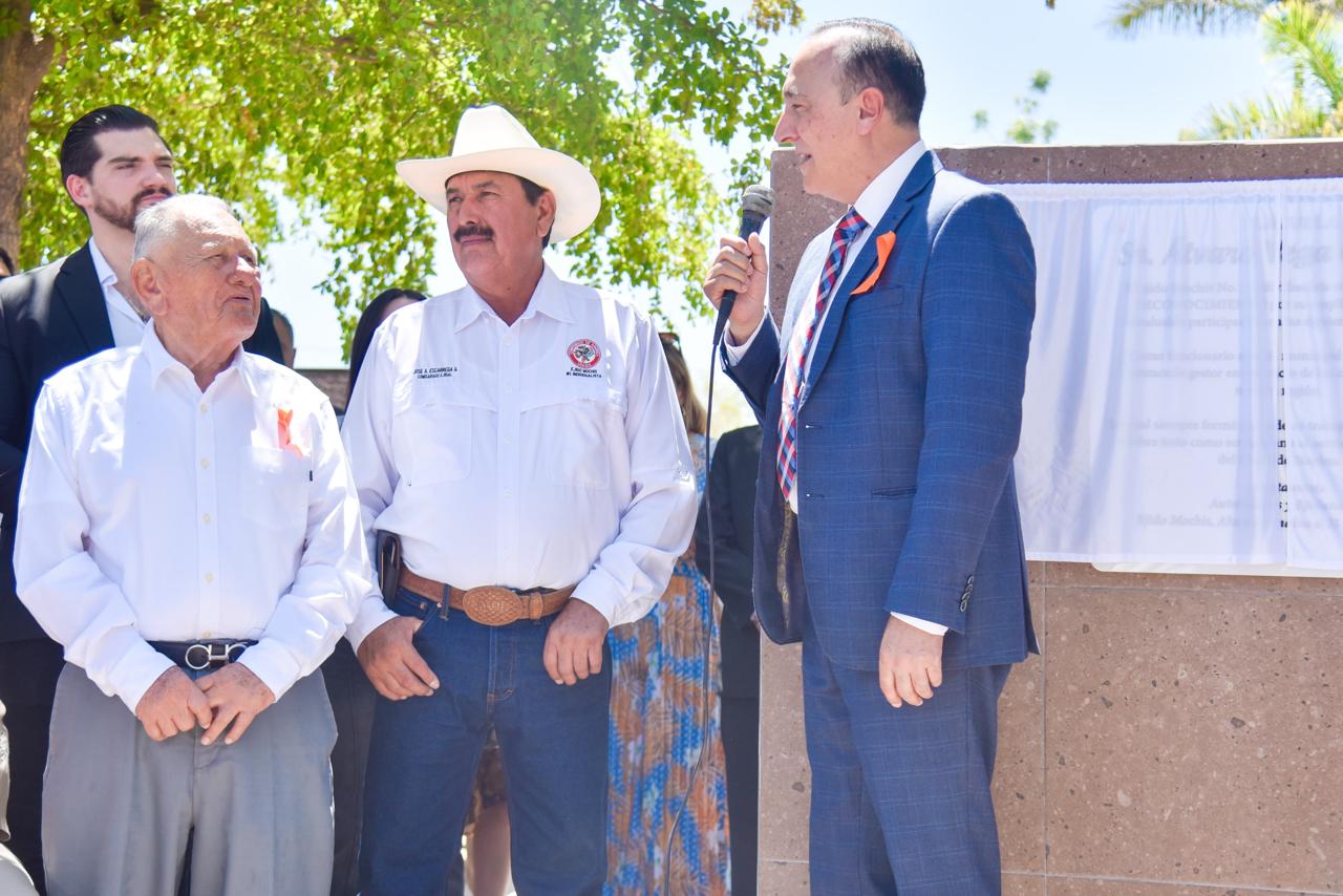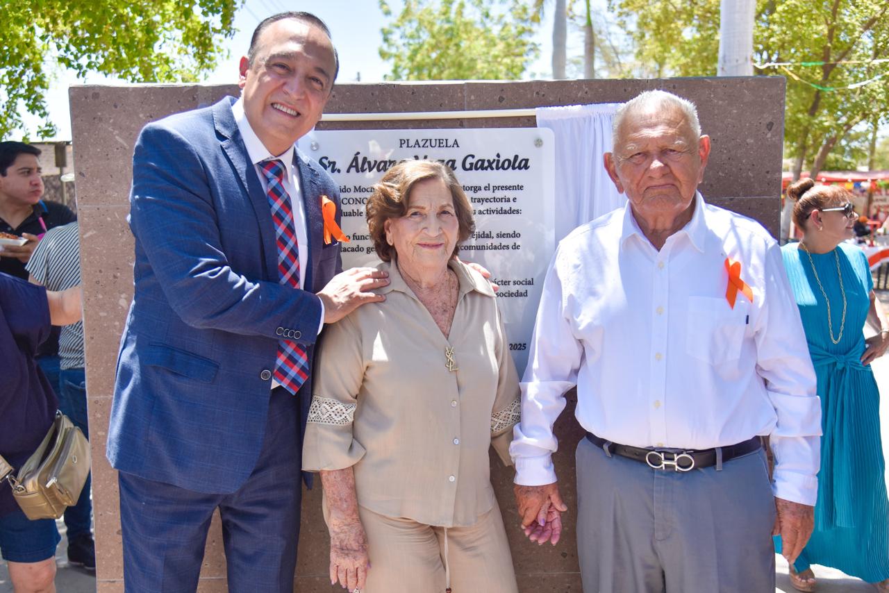 Ejido Mochis, Ahome, Sinaloa. – En el marco del 92 aniversario de la fundación del Ejido Mochis, cabecera de la Sindicatura Central, autoridades municipales encabezadas por el Alcalde Antonio Menéndez De Llano Bermúdez, develaron placa de reconocimiento a Álvaro Vega Gaxiola, habitante de esa comunidad, imponiéndole su nombre a la plazuela del lugar.