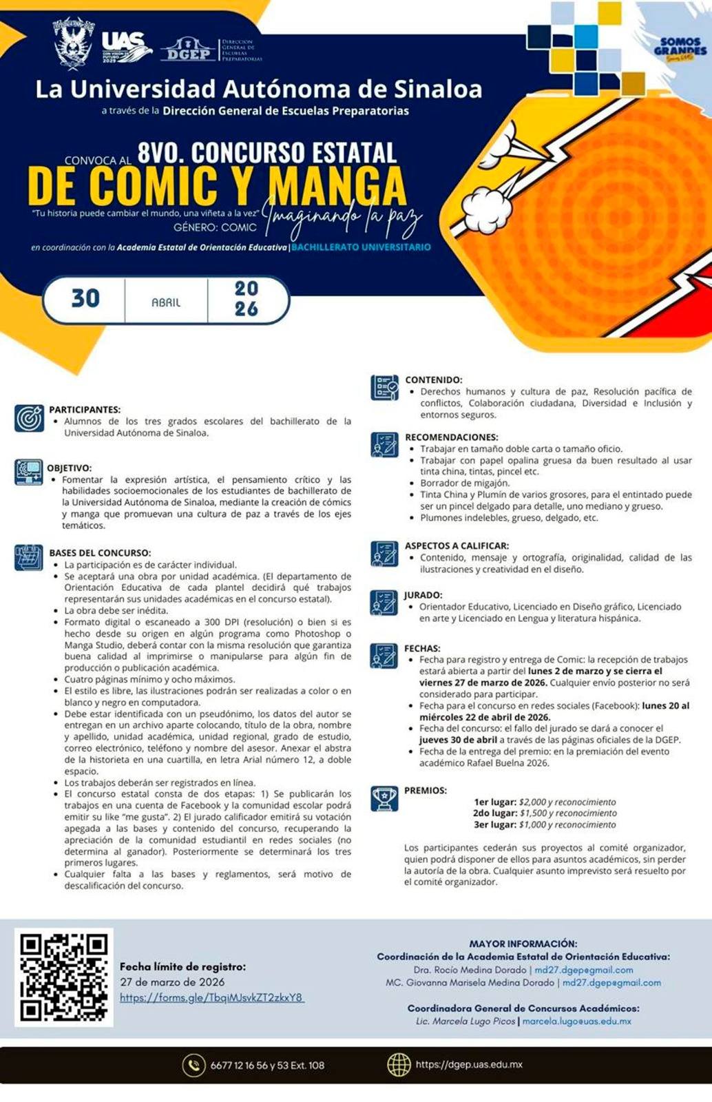 Por octava ocasión, la Dirección General de Escuelas Preparatorias (DGEP) de la Universidad Autónoma de Sinaloa (UAS), a través de la Academia de Orientación Educativa, convoca al Concurso Estatal de Cómic y Manga. En esta edición, bajo el tema “Imaginando la paz”, podrán participar alumnos de cualquier grado de bachillerato. El plazo límite para registrar y entregar los trabajos es el 27 de marzo, según informó Rocío Medina Dorado.