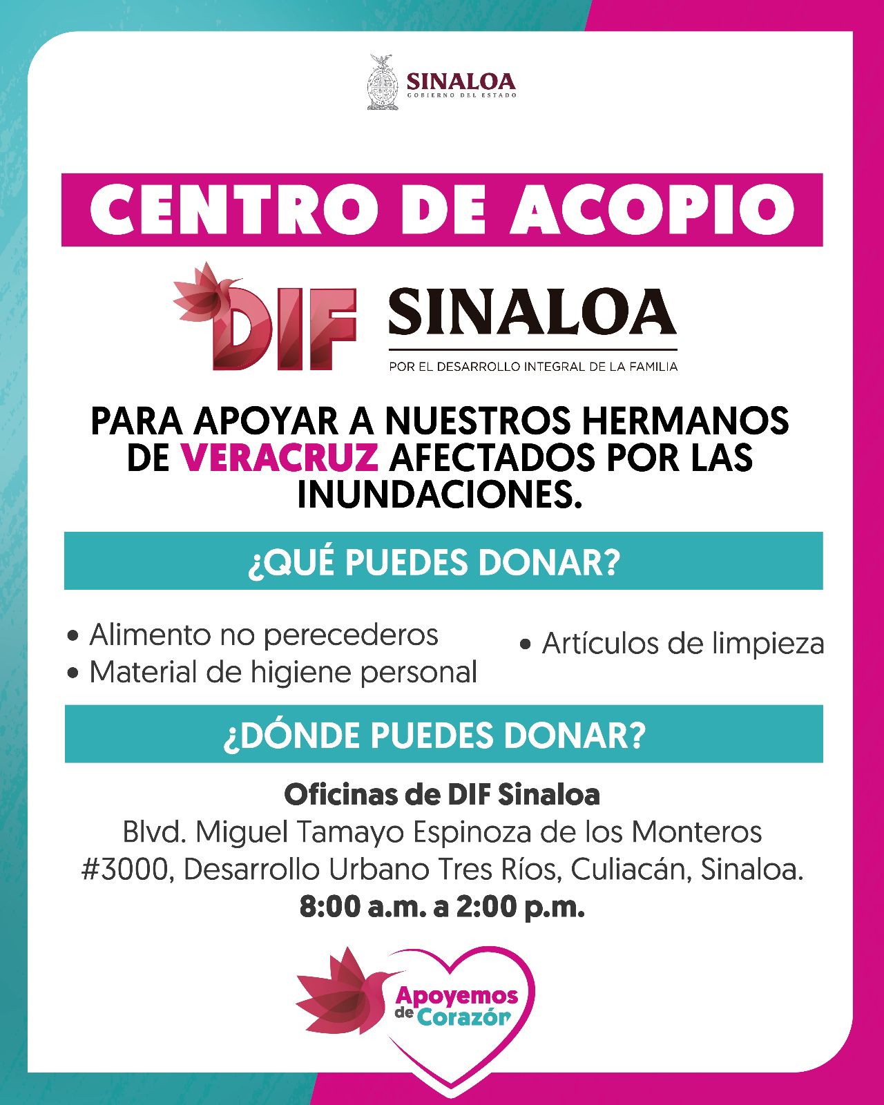 Culiacán, Sinaloa. – En apoyo a nuestros hermanos afectados por las intensas lluvias e inundaciones en el estado de Veracruz, el Sistema DIF Sinaloa, habilitó un centro de acopio en sus instalaciones, con la finalidad de recolectar víveres, artículos de higiene personal y material de limpieza que serán destinados a las familias afectadas.