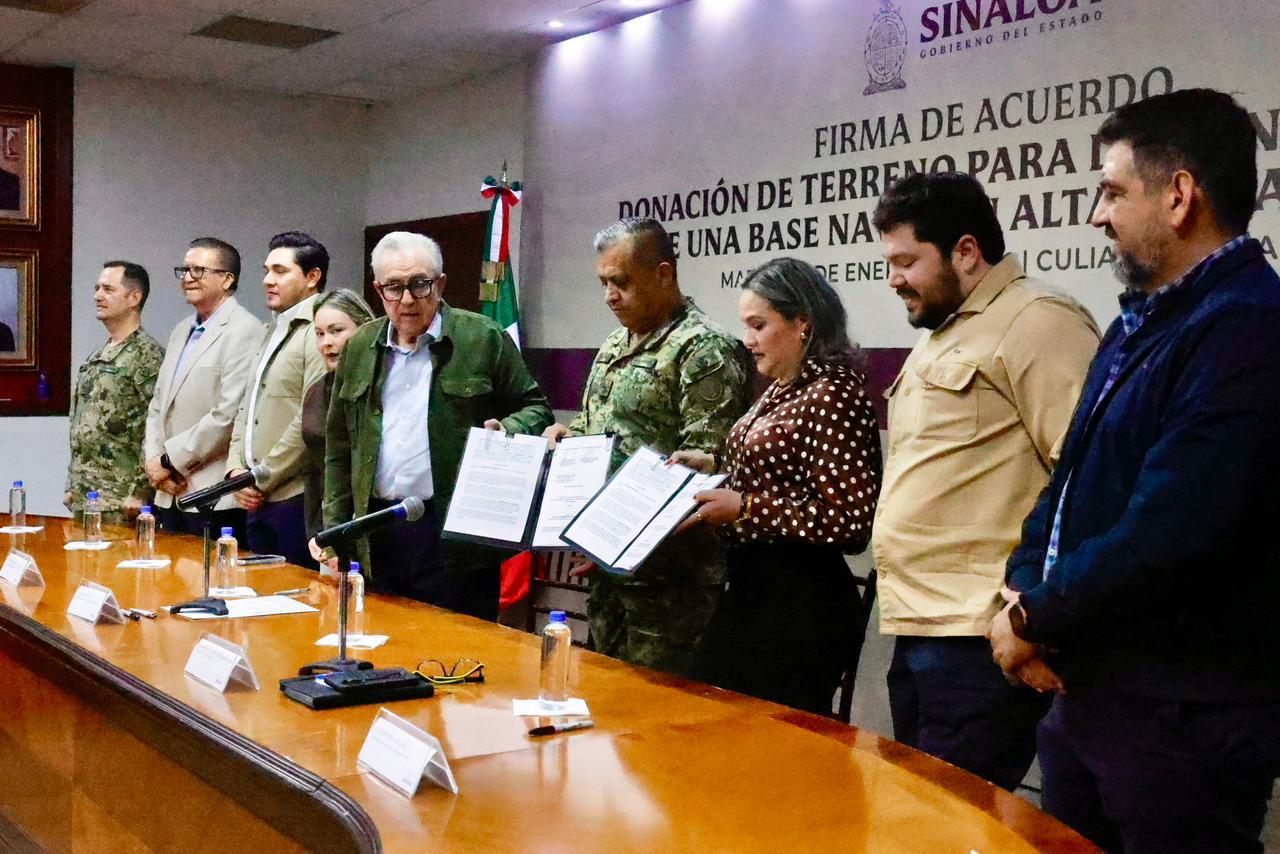 Culiacán, Sinaloa (13 de enero de 2026).- Para concretar el proyecto de la instalación de un Sector Naval en Nuevo Altata, en el municipio de Navolato, el gobernador Rubén Rocha Moya signó un acuerdo de donación de un predio con el comandante de la Cuarta Región Naval, vicealmirante José Daniel Reséndiz Sandoval, lo cual vendrá a dar mayor seguridad y confianza tanto a residentes como visitantes de este destino turístico, con la presencia permanente de mil 100 elementos de la Secretaría de Marina.