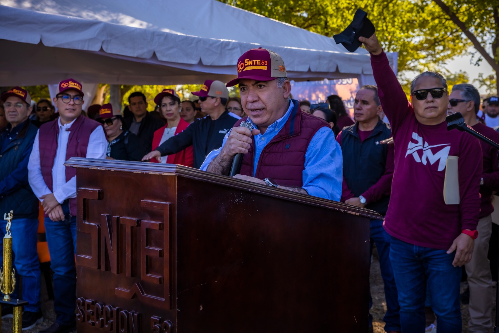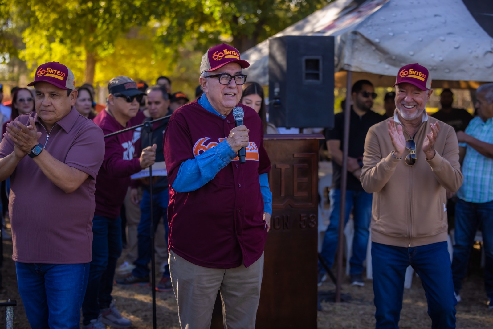 Caba destacar que luego de darle la bienvenida, el líder sindical, el maestro Ricardo Madrid, le entregó al gobernador Rocha un reconocimiento a nombre del Sindicato Nacional de Trabajadores de la Educación, Sección 53, por su apoyo para el magisterio estatal.