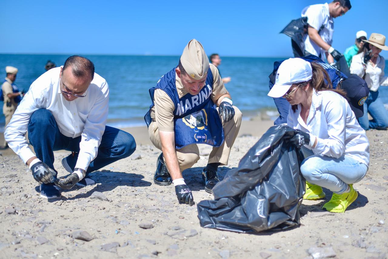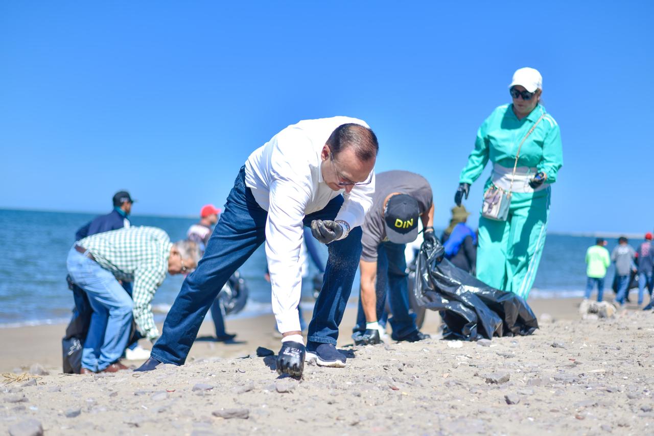 El Alcalde Antonio Menéndez De Llano Bermúdez junto con el comandante de la Octava Zona Naval Militar de Topolobampo, Saúl Hiram Bandala Garza, acompañados de personal naval, funcionarios municipales y ciudadanía, se concentraron a temprana hora en el balneario para retirar los desperdicios, principalmente plástico y vidrio.