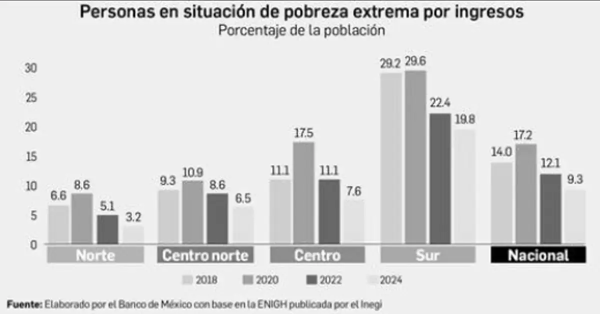 La información divulgada por el banco central muestra que en la región sur –que abarca Campeche, Chiapas, Guerrero, Oaxaca, Quintana Roo, Tabasco, Veracruz y Yucatán–, el porcentaje de las personas que viven en esta condición pasó de 29.2 en 2018 a 19.8 en 2024.