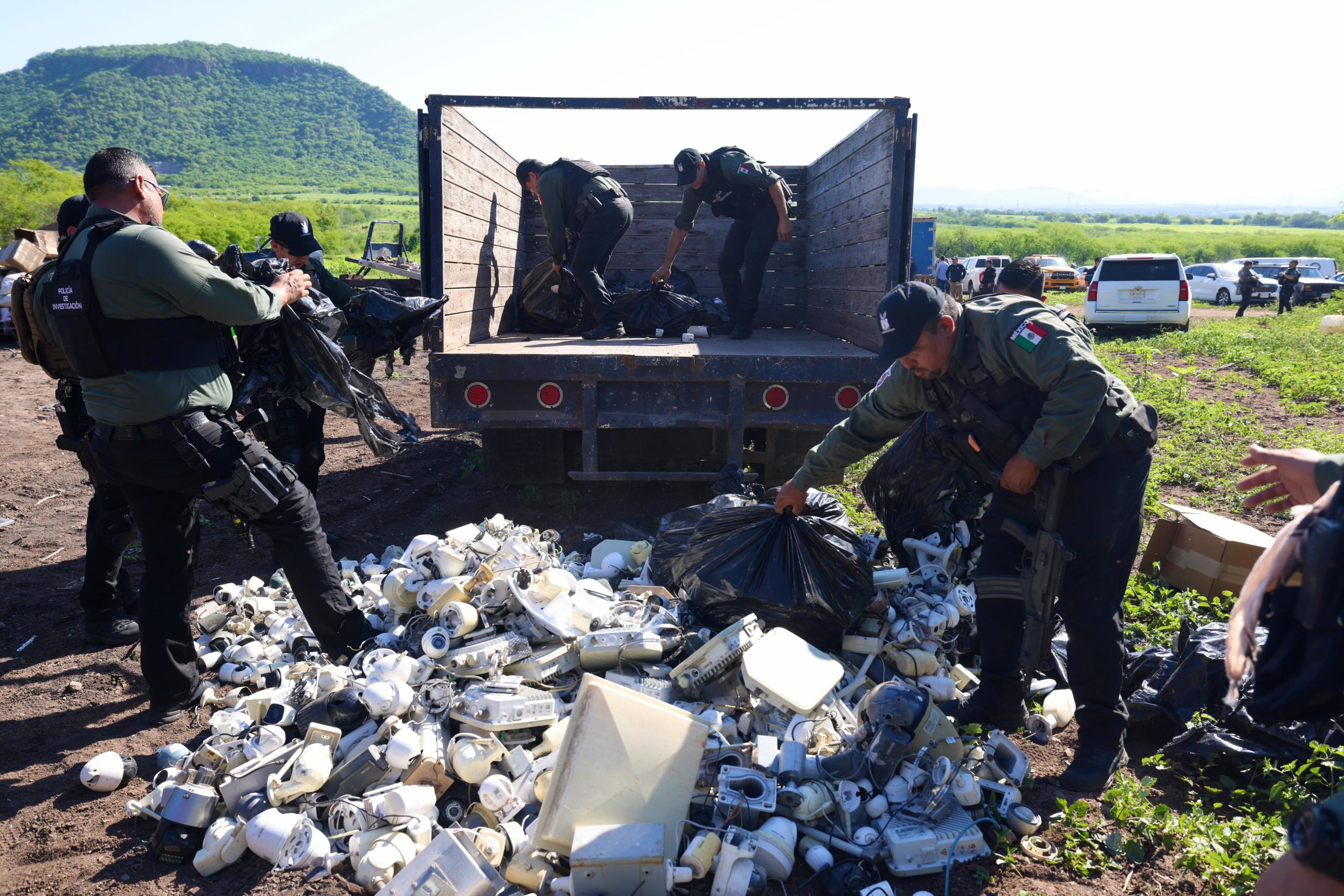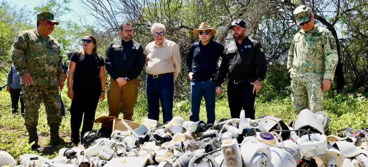 El mandatario estatal asistió por tercera ocasión a un predio ubicado en el ejido Los Becos, al sur de Culiacán, lugar donde la Fiscalía General de la República realiza de manera periódica la incineración de drogas, y en esta ocasión también participó la Fiscalía General del Estado, pues por primera vez se procedió a la destrucción de mil 652 cámaras de videovigilancia clandestinas, que han sido retiradas de la vía pública.