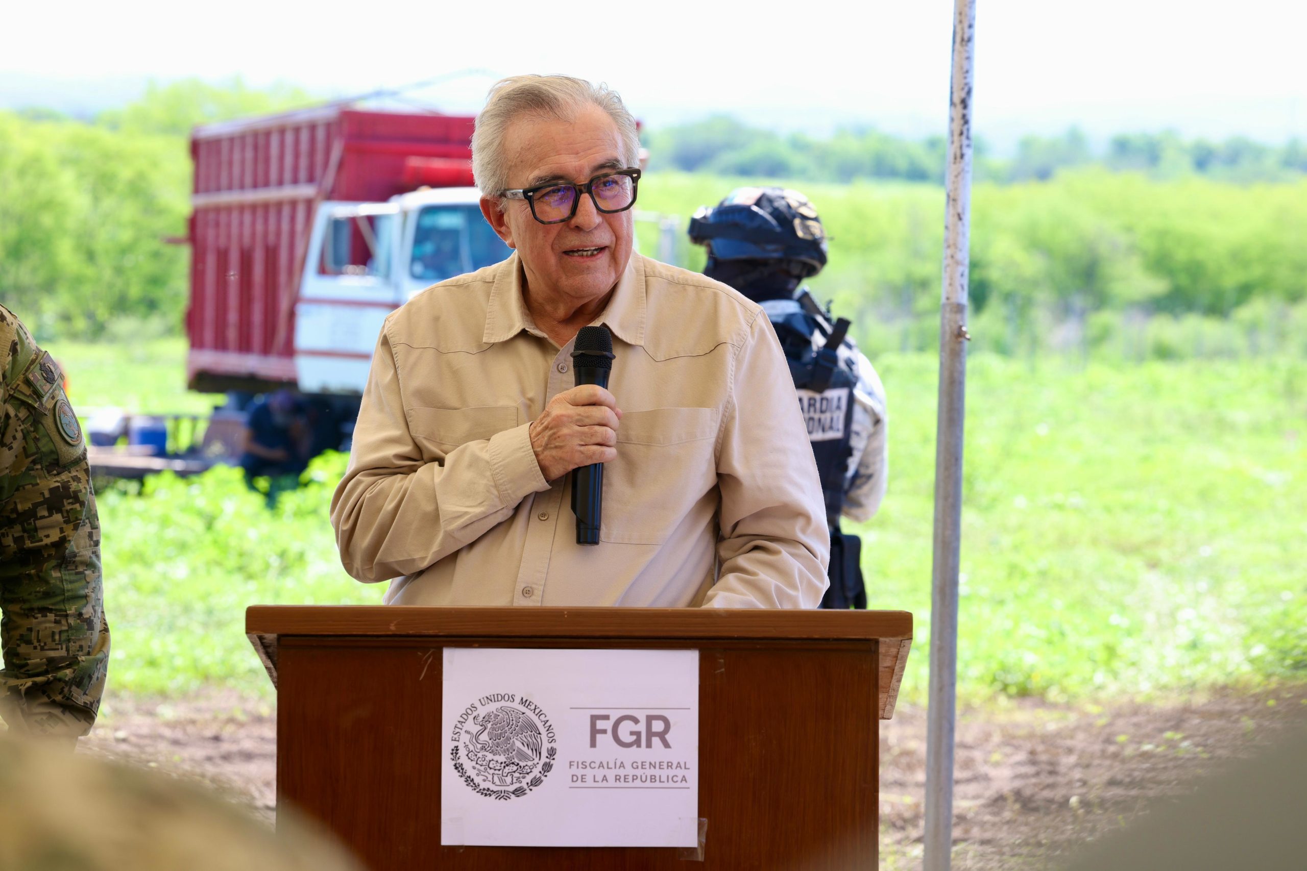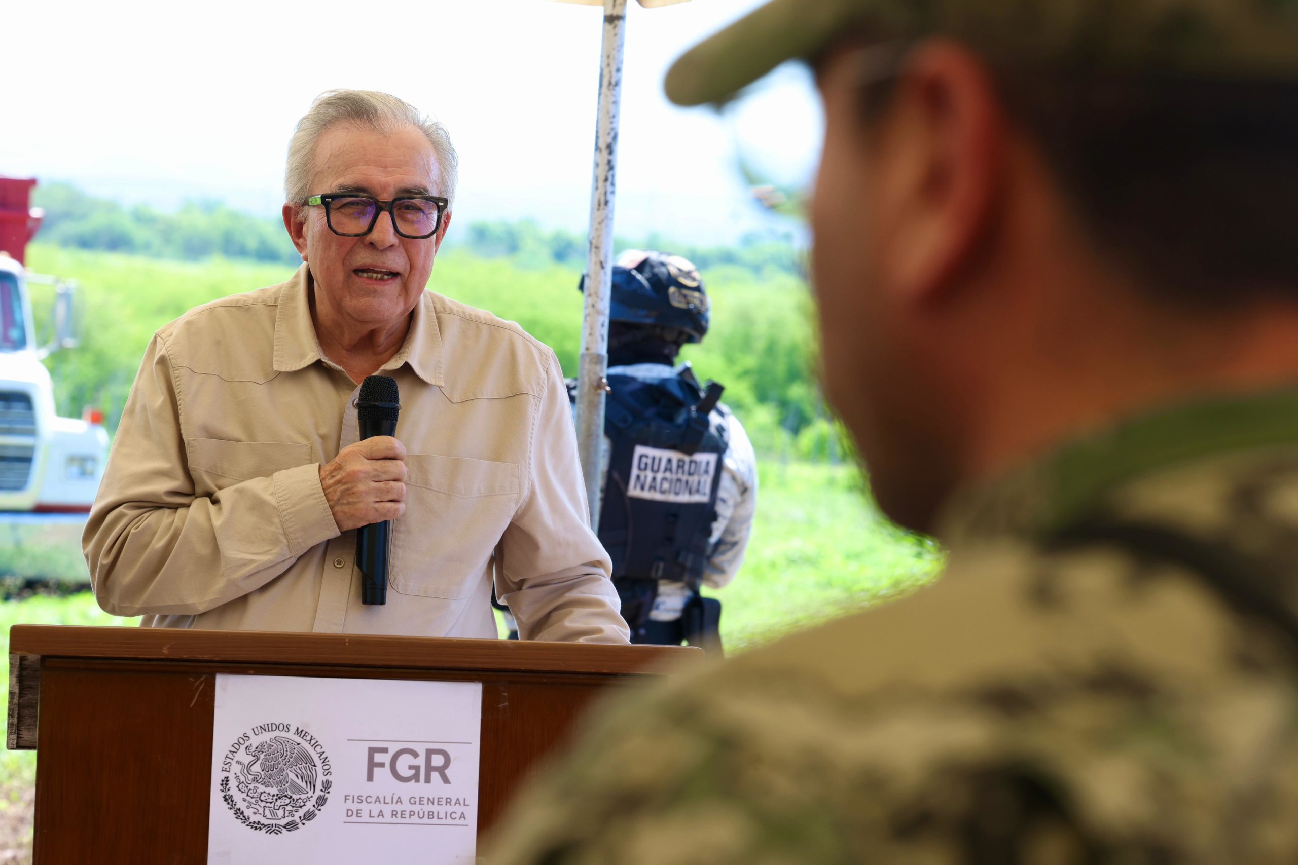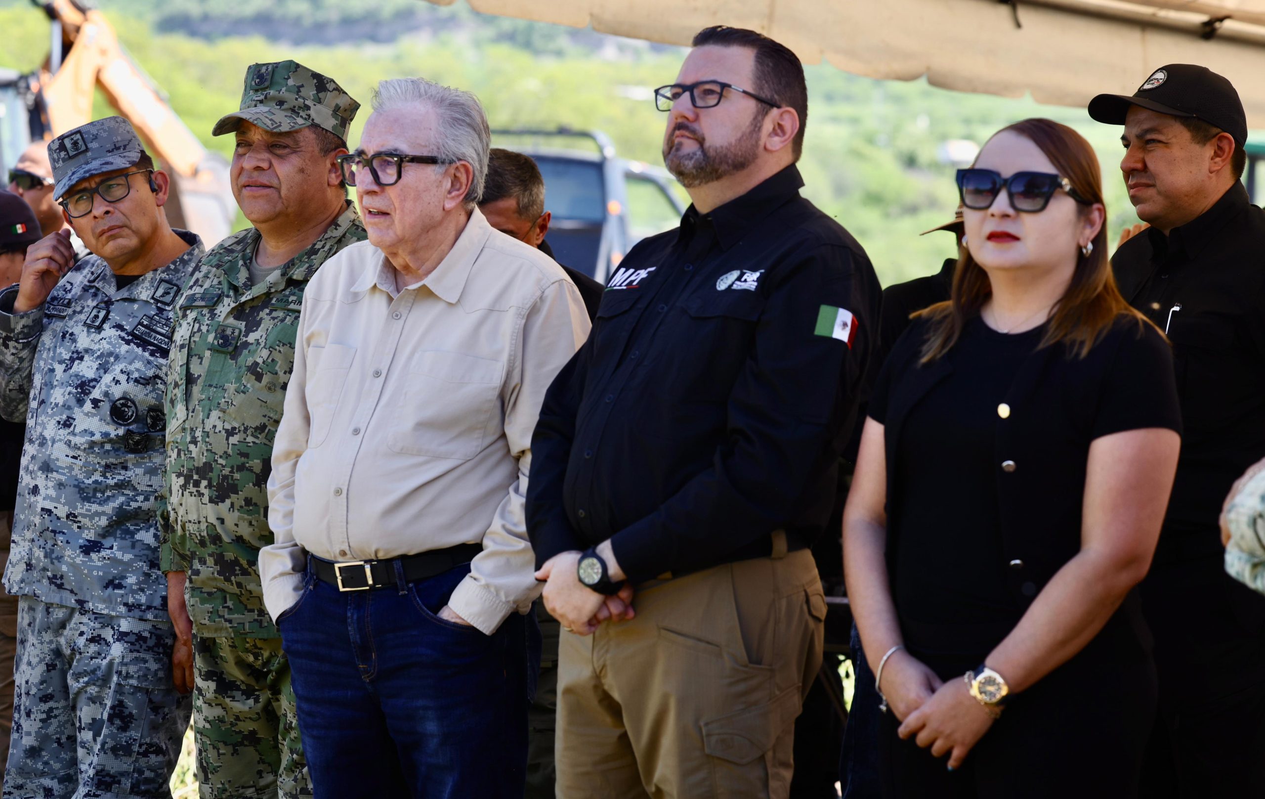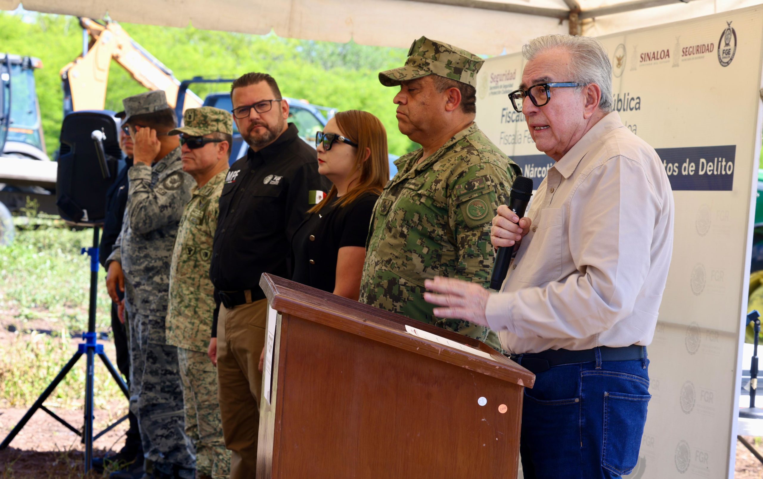 También acompañar al gobernador Rocha el comandante de la Novena Zona Militar, general Porfirio Fuentes Vélez; el comandante de Cuarta Región Naval, vicealmirante José Daniel Reséndiz Sandoval; el coordinador de la Guardia Nacional en Sinaloa, general Francisco Alvarado Terán; el representante de la Secretaría de Seguridad y Protección Ciudadana, Iván Álvarez Salgado; y el secretario de Seguridad Pública, general Oscar Rentería Schazarino.