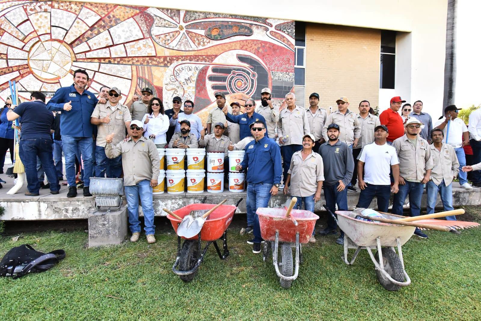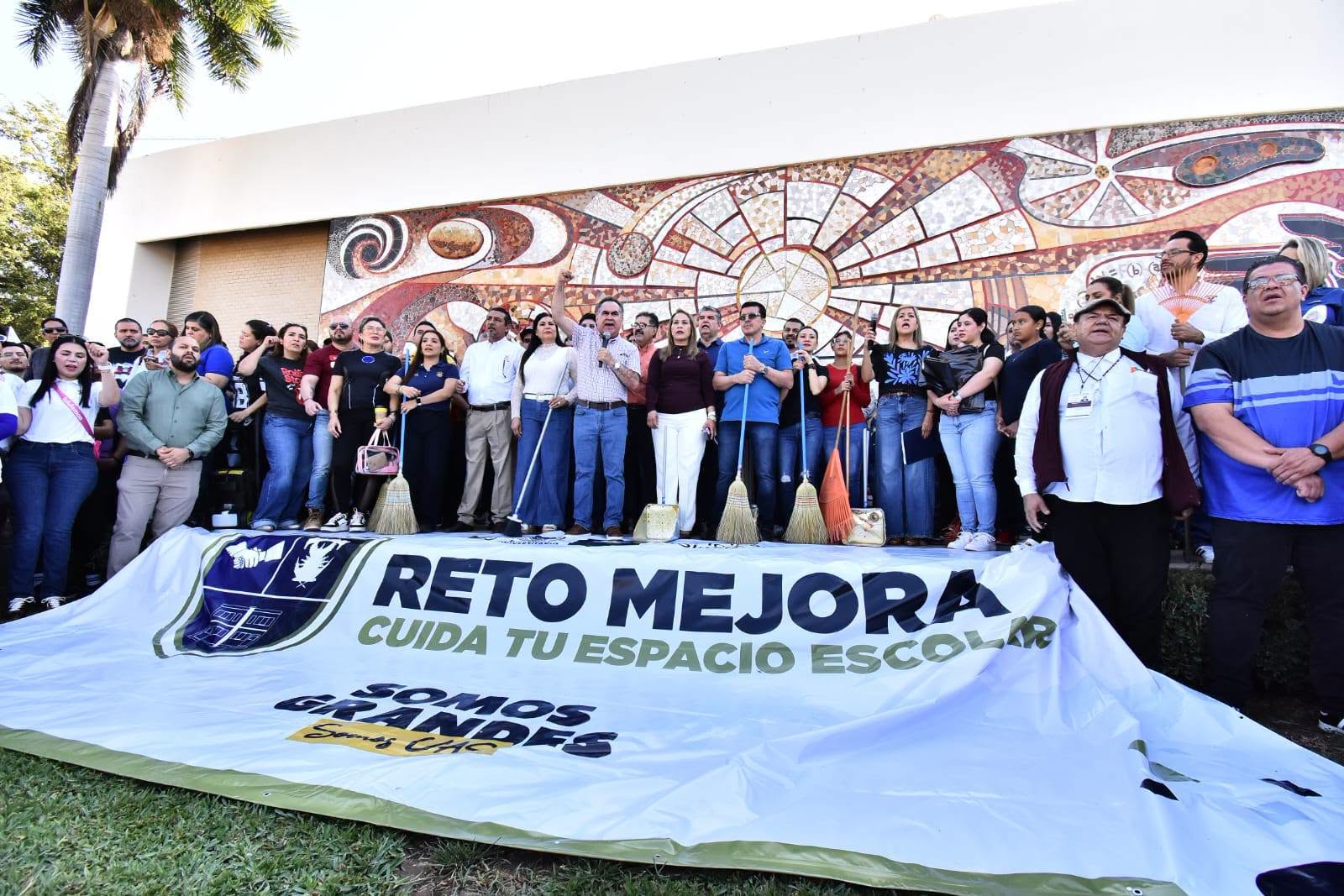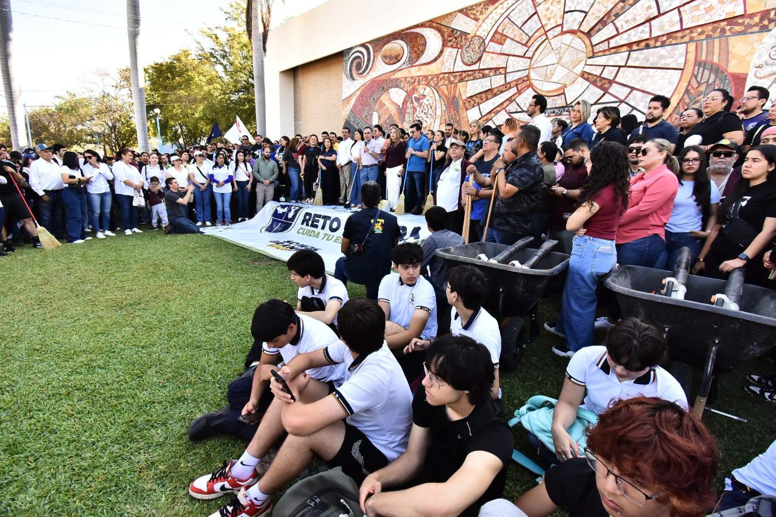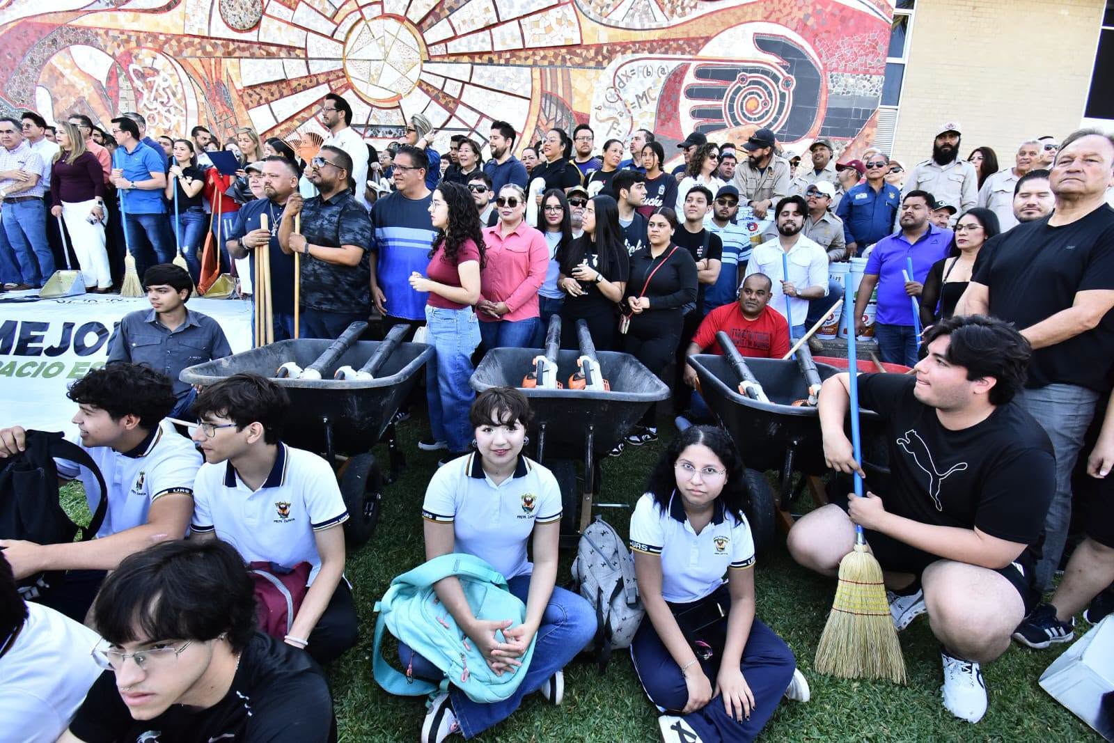 Al pie del emblemático mural “Irradiación para la Cultura y la Vida”, en Ciudad Universitaria, el Rector de la Universidad Autónoma de Sinaloa (UAS), doctor Jesús Madueña Molina —acompañado de la doctora Sofía Angulo de Madueña y la comunidad universitaria— inauguró las actividades del programa institucional “Reto Mejora: Cuida tu Espacio Universitario”.
