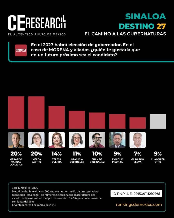 Su 7 por ciento lo ubican como un candidato a suplir al Gobernador de Sinaloa Rubén Rocha Moya al término de su mandato en la ruta del 2027