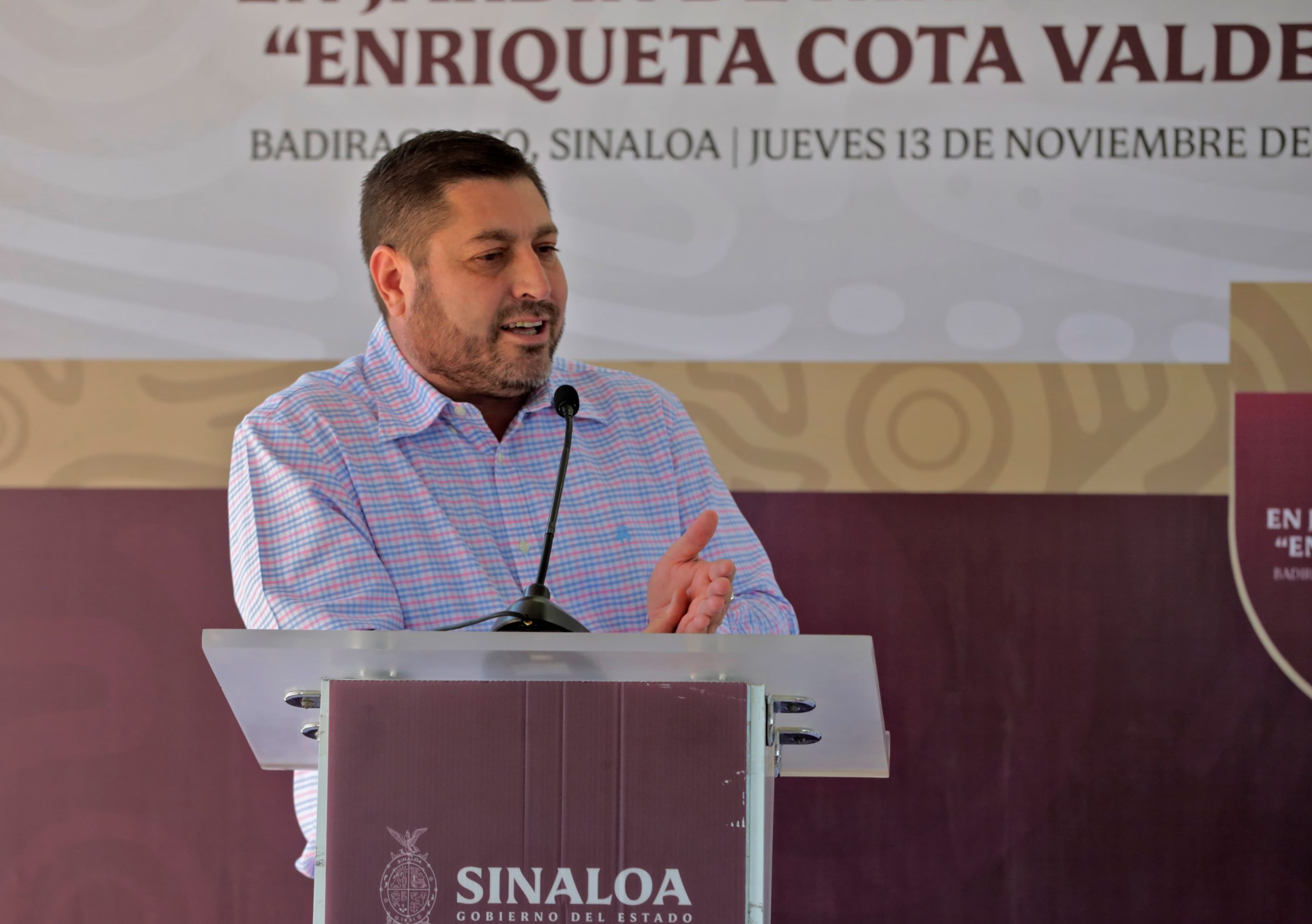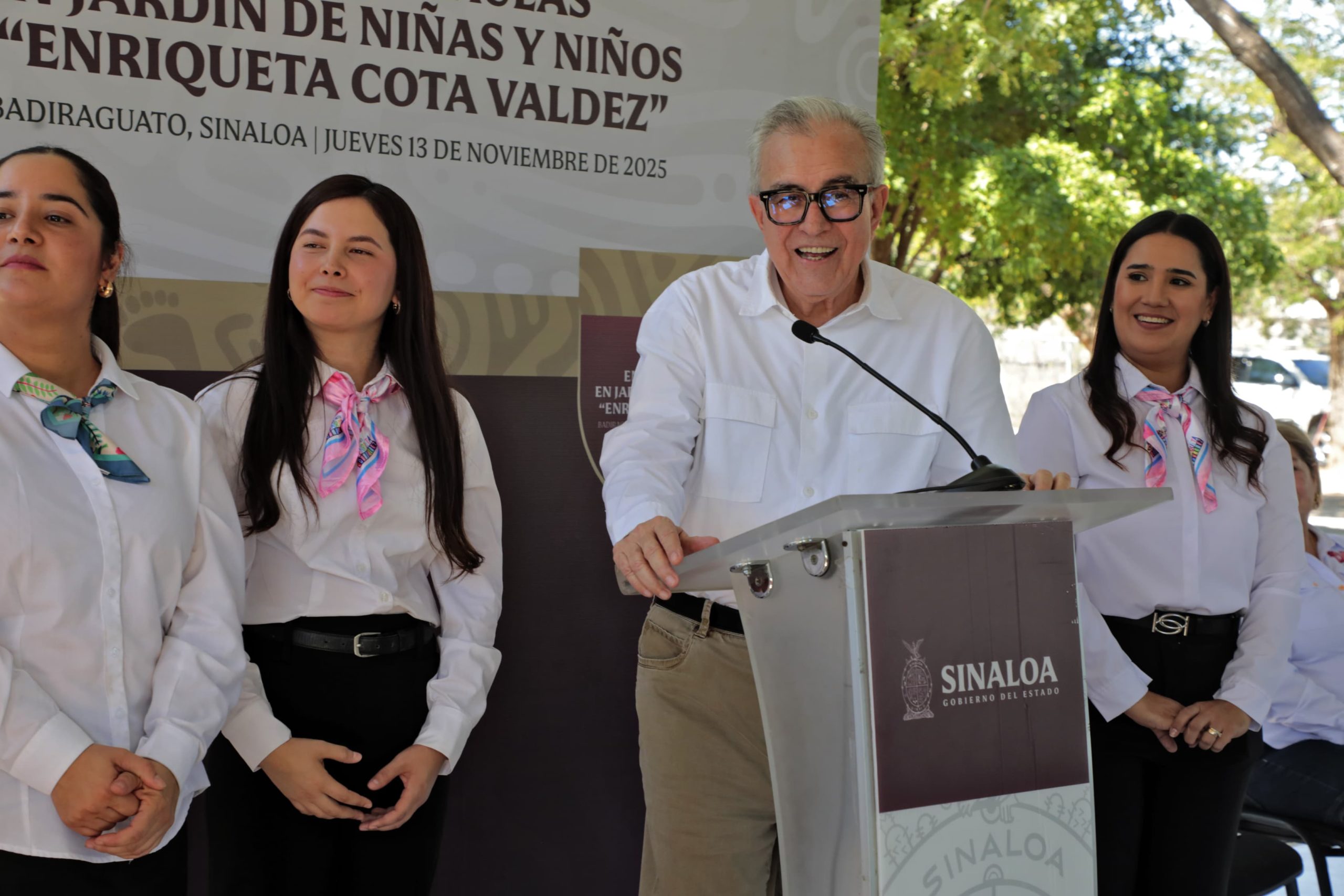 Badiraguato, Sinaloa. – El gobernador Rubén Rocha Moya visitó la cabecera municipal de Badiraguato, para entregar en compañía del presidente municipal, José Paz López Elenes, tres aulas del Jardín de Niños “Profesora Enriqueta Cota Valdez”, así como la entrega de enseres de cocina para el programa de desayunos calientes, obras y mobiliario en las que se invirtieron 4 millones 100 mil pesos.