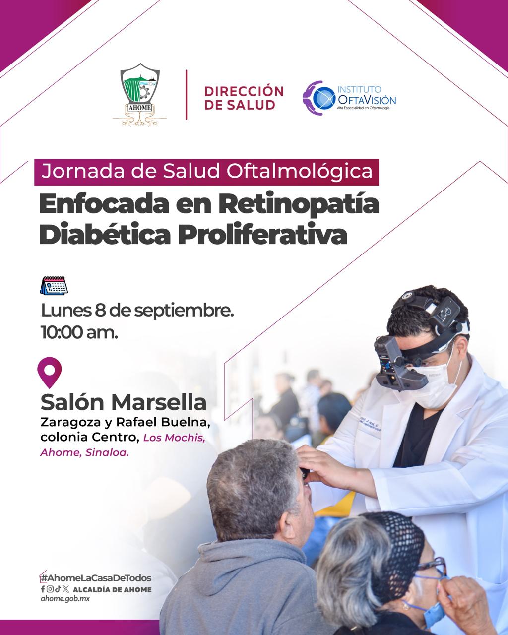 Los Mochis, Ahome, Sinaloa. – Con el respaldo del Presidente Municipal Antonio Menéndez De Llano Bermúdez, el Ayuntamiento de Ahome, a través de la Dirección de Salud Municipal en coordinación con Oftavisión, presentó la Jornada de Salud Oftalmológica de Retinopatía Diabética Proliferativa, que se llevará a cabo el próximo lunes 8 de septiembre a partir de las 8:00 de la mañana en el Salón Marsella, ubicado en las calles Zaragoza y Rafael Buelna.