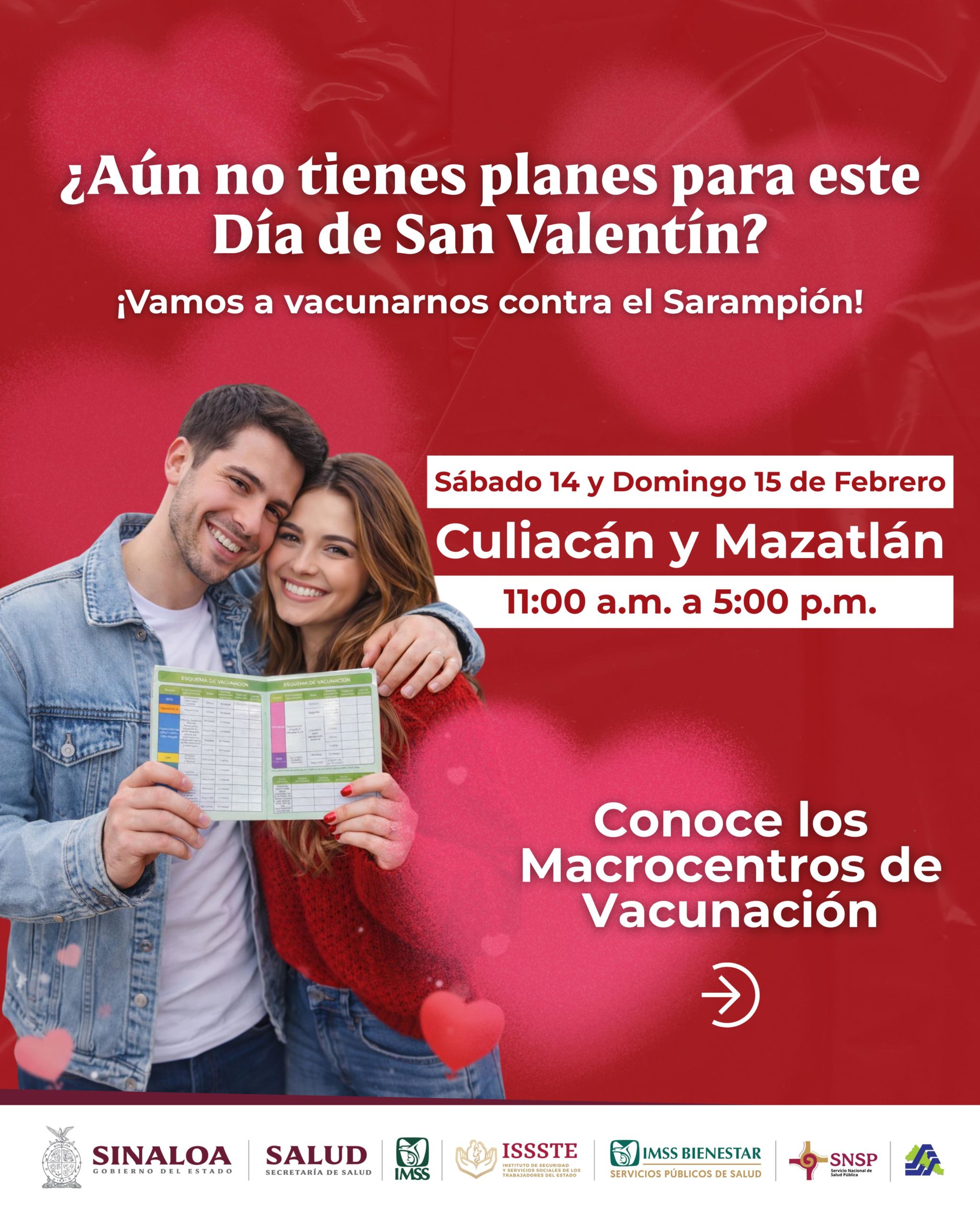 Culiacán, Sinaloa. – ¿Aún no tienes planes para este 14 de febrero Día de San Valentín? La Secretaría de Salud de Sinaloa te invita a que te vacunes contra el sarampión en los macrocentros que se instalarán en diferentes puntos de Culiacán y Mazatlán.