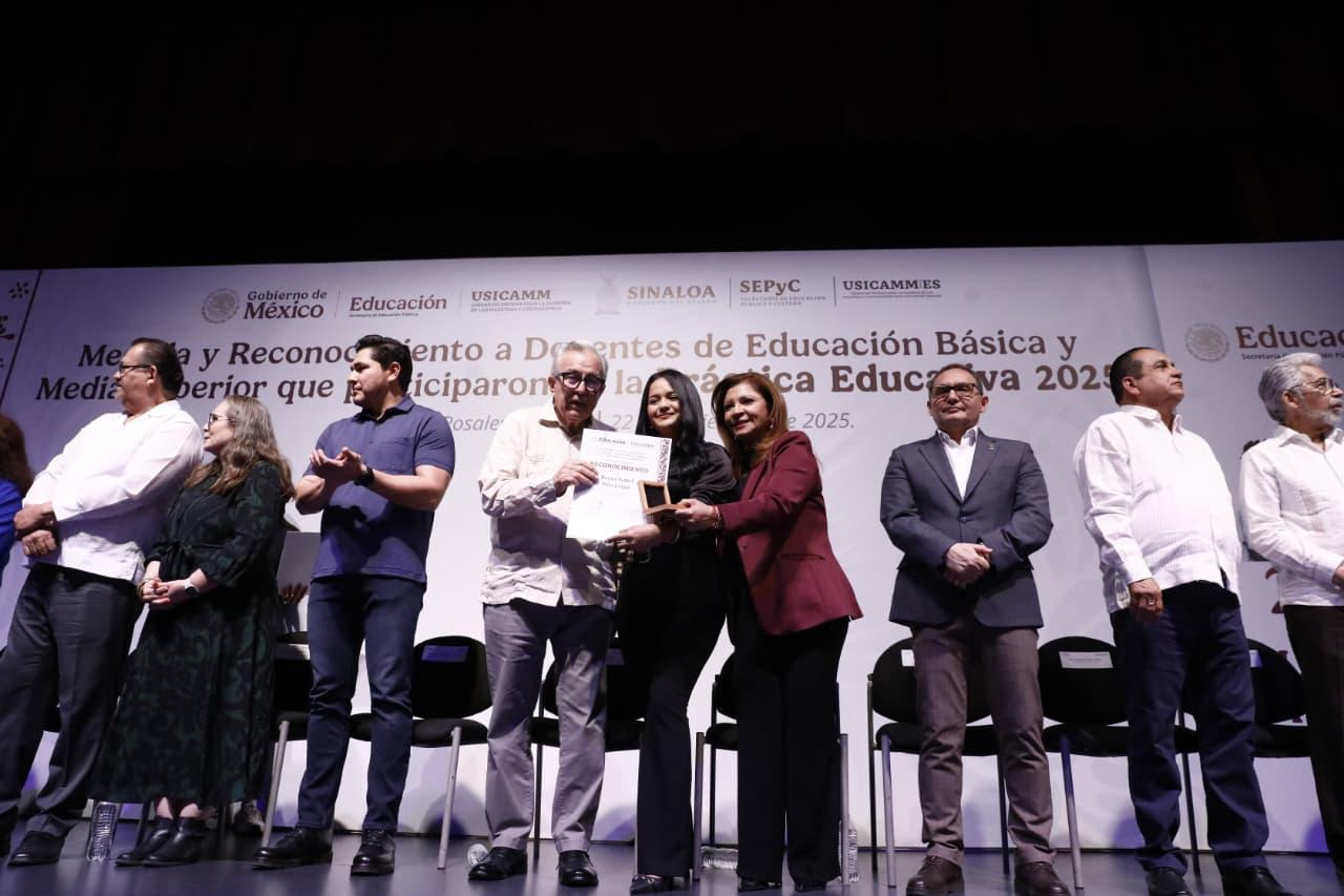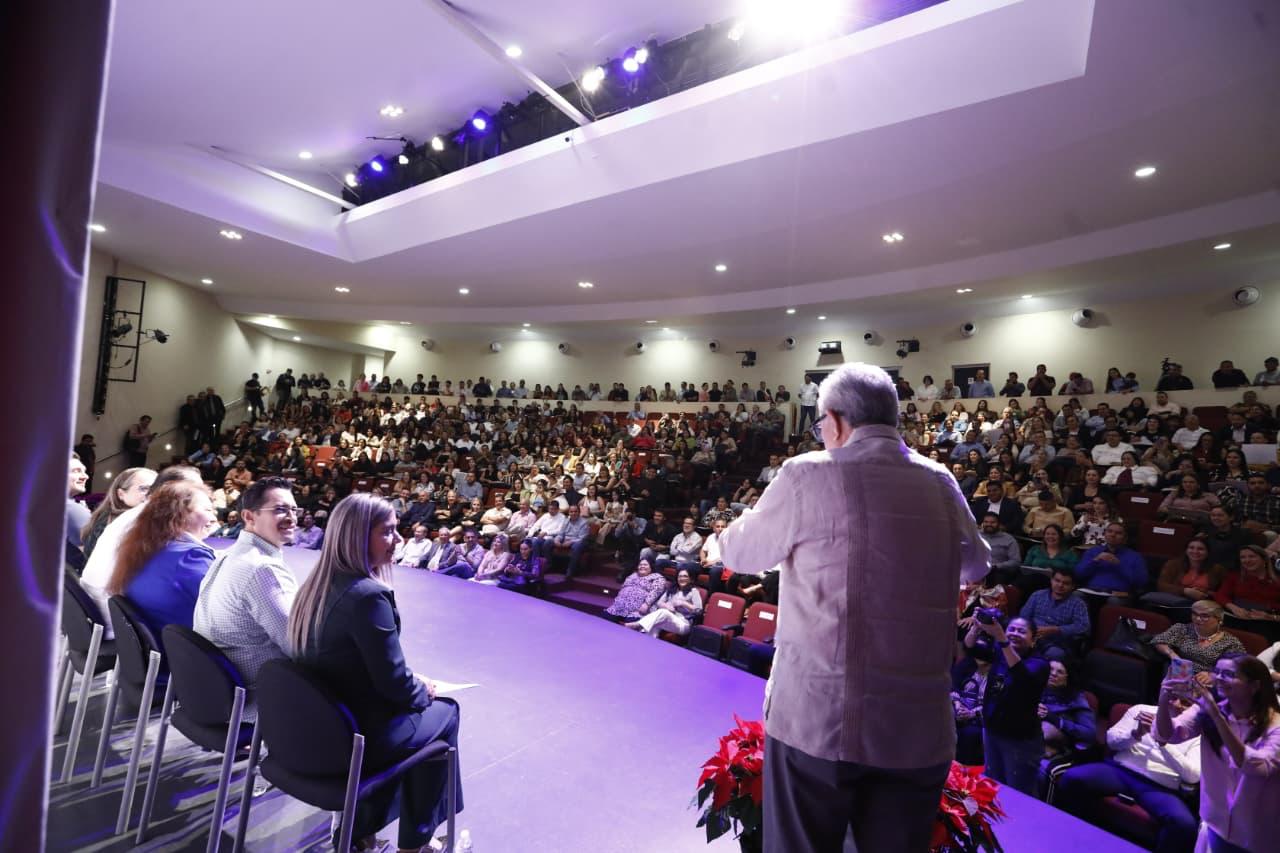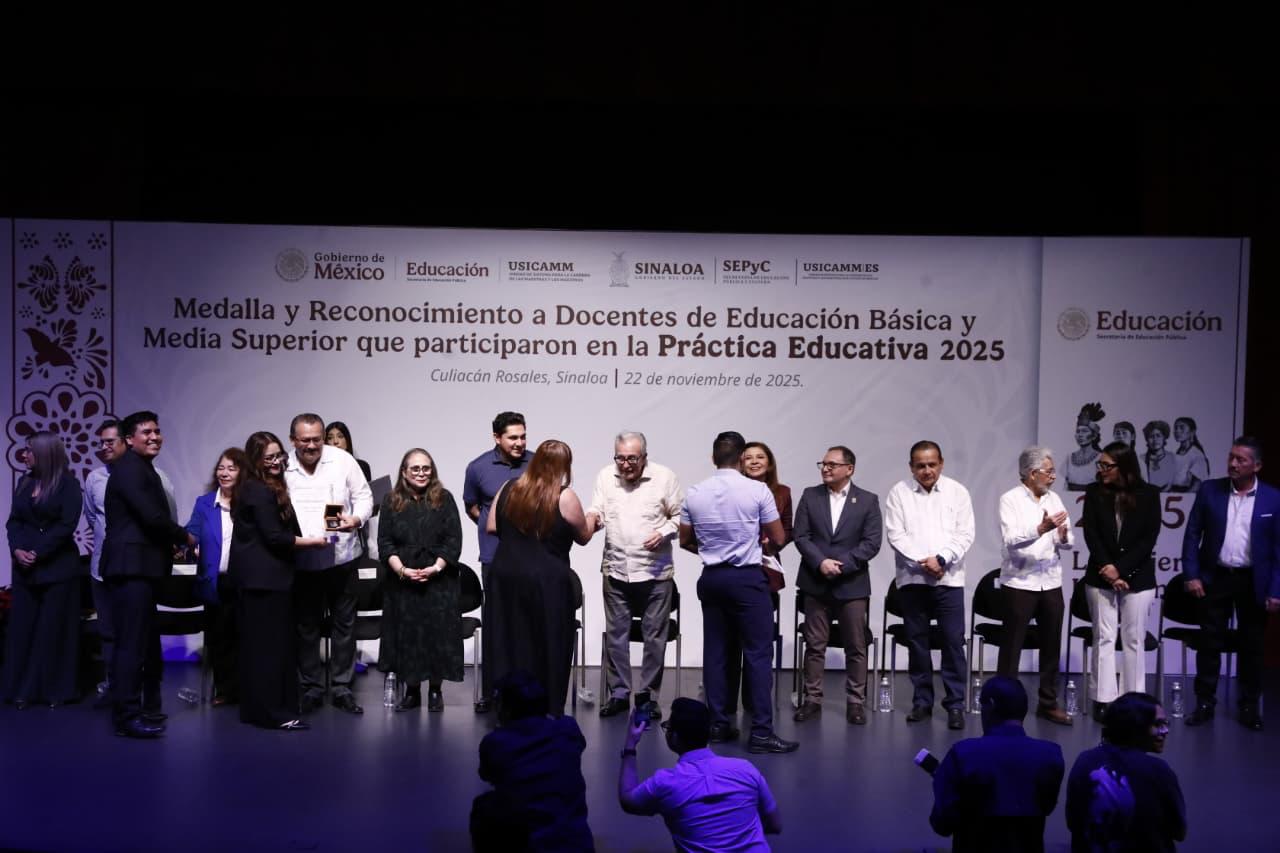 El mandatario estatal acudió al Teatro Lince, de la Universidad Autónoma de Occidente, para hacer entrega de sus constancias y un estímulo económico de 10 mil pesos, a 276 maestras y maestros que culminaron su curso de capacitación en Práctica Educativa 2025, que representó una inversión de 2 millones 760 mil pesos de recursos del Gobierno del Estado.