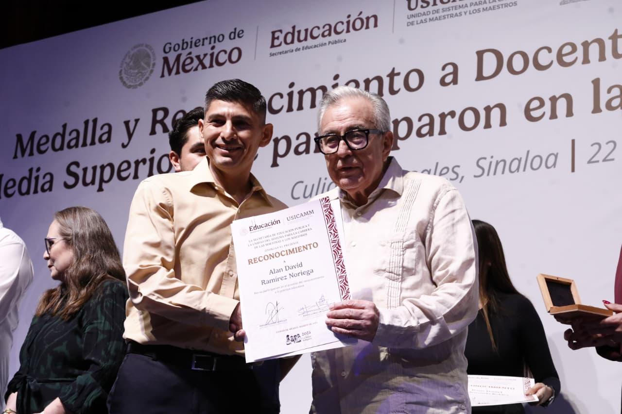 Acompañado por la secretaria de Educación Pública y Cultura, Gloria Himelda Félix Niebla, y por ambos dirigentes del SNTE en Sinaloa, Ricardo Madrid Uriarte, de la Sección 53; y Genaro Torrecillas López, de la Sección 27, el gobernador Rocha entregó a cada uno de los maestros su reconocimiento, al tiempo que les exhortó a seguirse capacitando, aprovechando las herramientas que pone a su alcance su gobierno, como son estos dos programas de formación.
