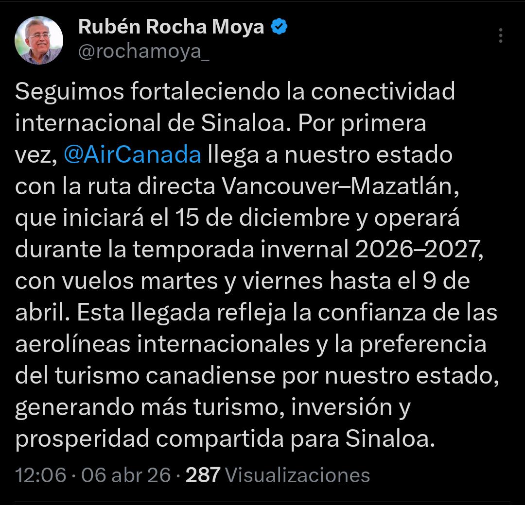 A través de su cuenta de X, el gobernador de Sinaloa, Rubén Rocha Moya, subrayó que esta conexión refleja la confianza de las aerolíneas internacionales y la preferencia del turismo canadiense por el estado de Sinaloa.