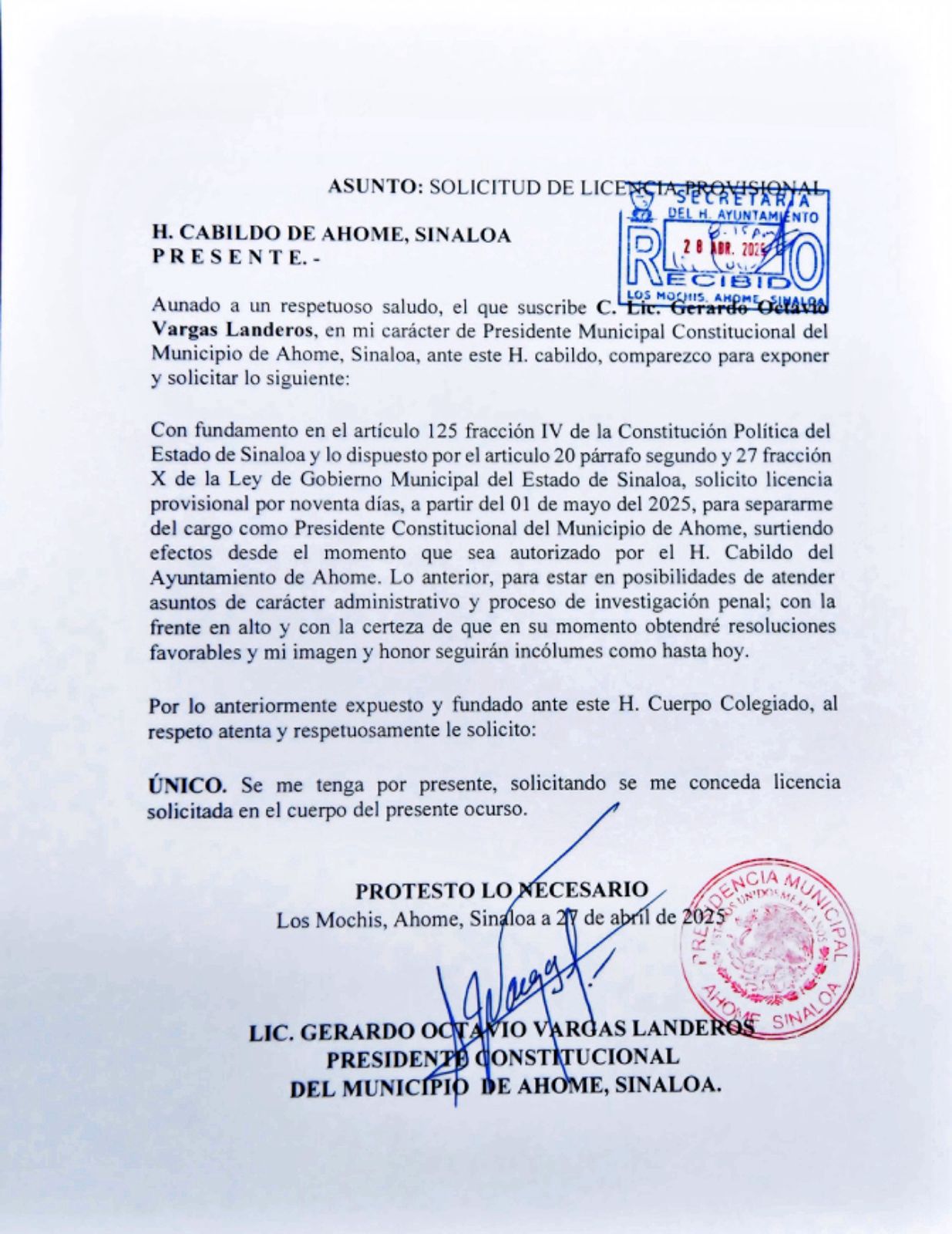 Ahome, Sinaloa. – En sesión extraordinaria y de carácter privado celebrada este miércoles, el Cabildo del H. Ayuntamiento de Ahome aprobó por unanimidad la solicitud de licencia provisional hasta por 90 días presentada por el alcalde Gerardo Vargas Landeros, quien expresó su determinación de separarse temporalmente del cargo con el objetivo de atender de manera directa y personal asuntos de carácter administrativo, así como el proceso de investigación penal promovido por instancias estatales.