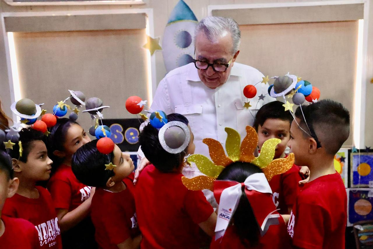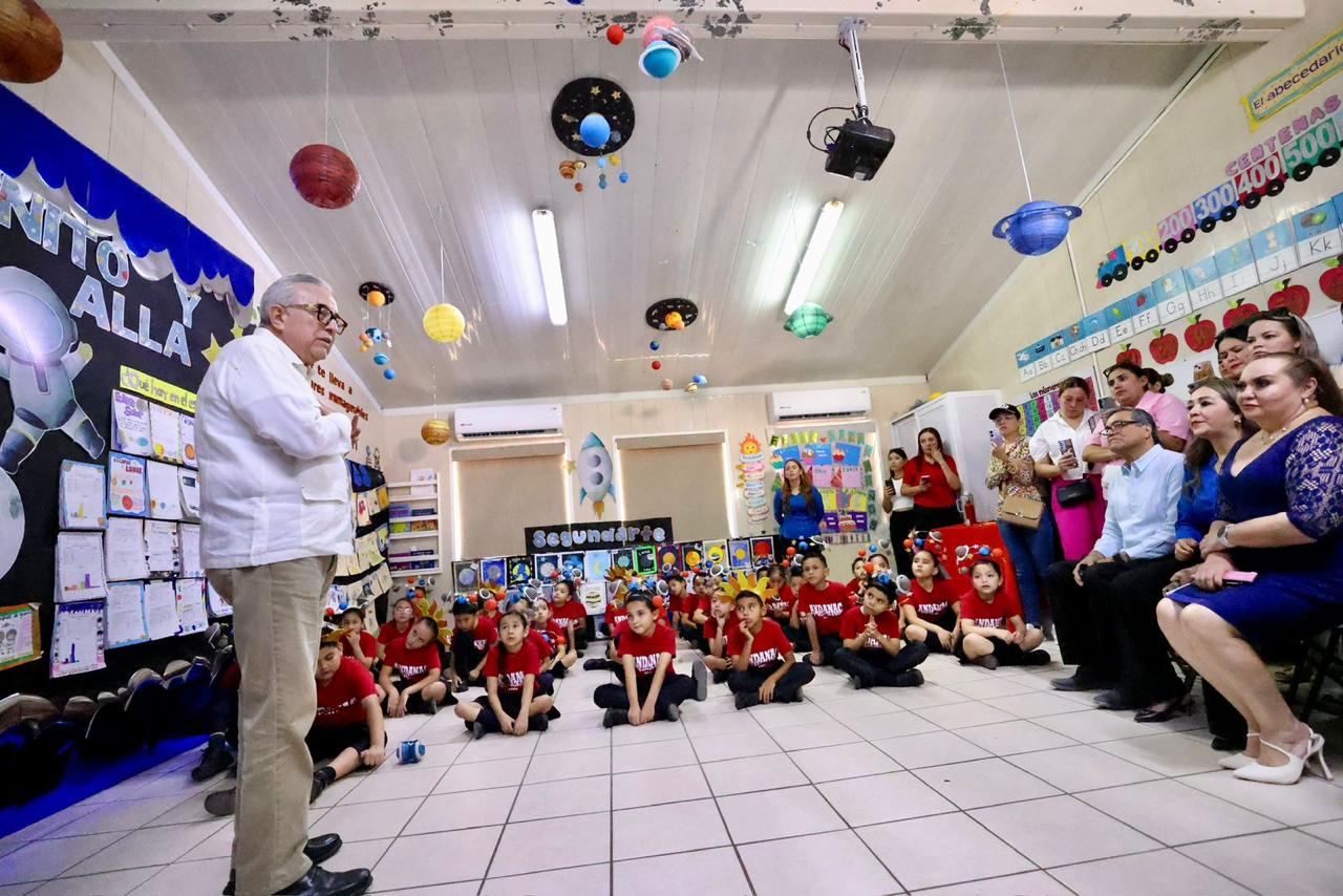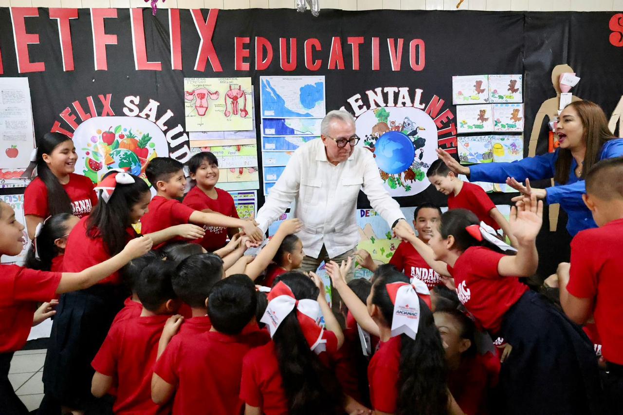El gobernador Rocha inició su gira de trabajo por el municipio de Ahome, con la visita a la Escuela Primaria Fundación ANDANAC NISSAN, donde primeramente se reunió con las niñas y niños y sus maestros, para escuchar también sus necesidades, y en respuesta a ello, giró instrucciones al director del ISIFE, Hugo Echave Meneses, quien lo acompañó, para dotar de mobiliario al plantel y la instalación también de unos juegos infantiles, lo cual fue lo que le solicitaron los niños en sus aulas.