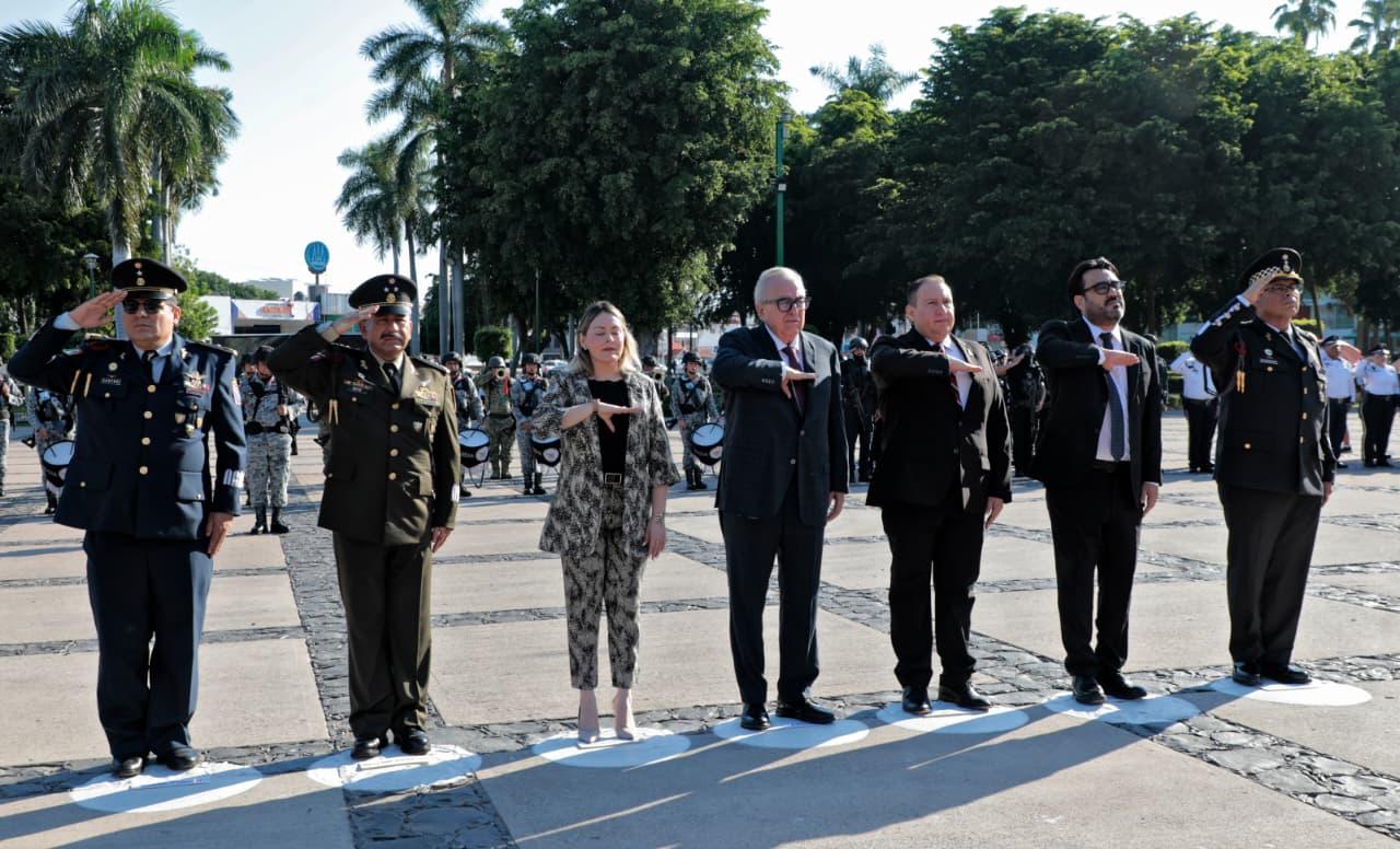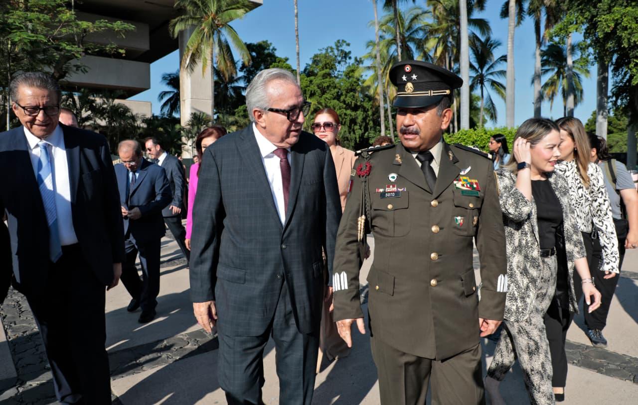 El mandatario estatal estuvo acompañado por Yeraldine Bonilla, presidenta de la Mesa Directiva del Congreso del Estado; Jesús Iván Chávez Rangel, presidente del Supremo Tribunal de Justicia; Juan de Dios Gámez Mendívil, alcalde de Culiacán; Santos Gerardo Soto, comandante de la 9/a Zona Militar; Francisco Alvarado Terán, coordinador de la Guardia Nacional en Sinaloa; Cristián Eduardo Padilla, capital de la Base Aérea Militar N° 10, así como funcionarios públicos, tropas castrenses y elementos de las fuerzas de seguridad.